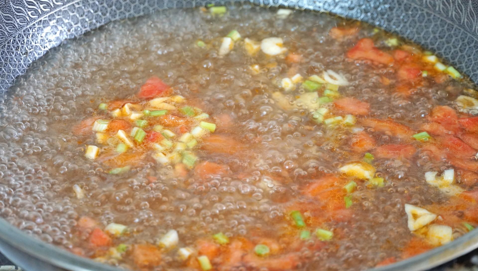 7、起鍋熱油,倒入蒜末爆香,接着把西紅柿倒進來炒一炒,加一勺鹽會更容易出汁兒,西紅柿炒好後倒入一碗清水,大火煮開,然後倒入我們麪疙瘩,煮的時候輕輕的用鍋鏟推動一下。