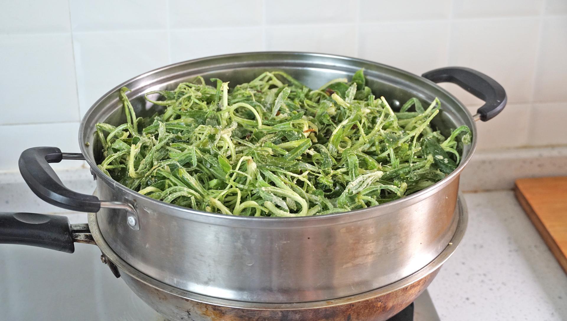 5、蒸籠鋪上不粘墊,接着把麪條菜放進去,水開後放上蒸籠,一定要等水開再放!然後開大火蒸3分鐘,時間不早長,3分鐘完全就夠了,不然麪條菜的顏色就不好看了。