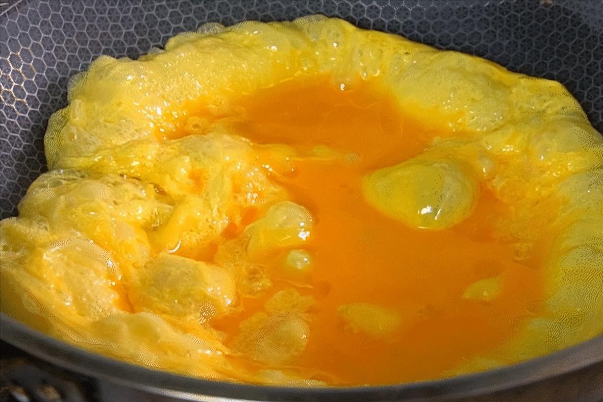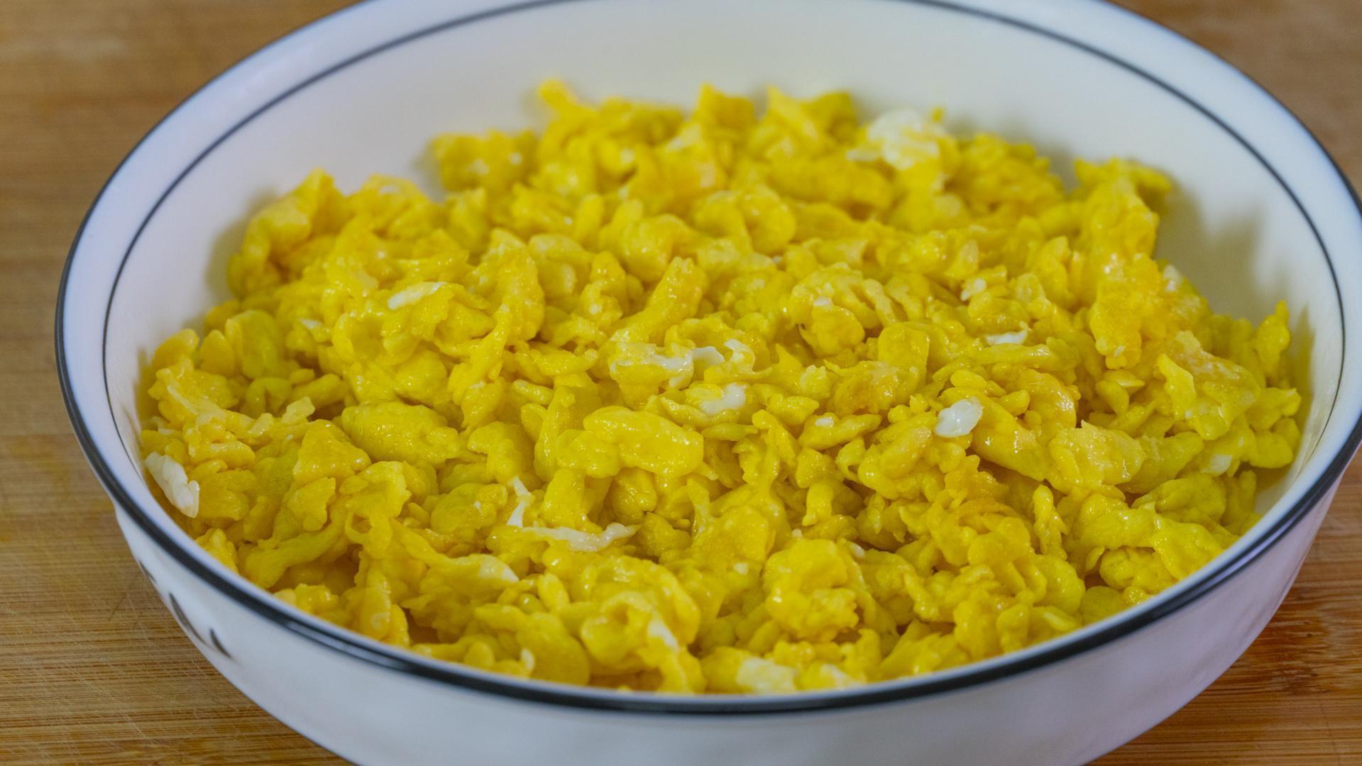 2、碗裏打入3個雞蛋,加一勺鹽和少許澱粉水,然後攪散,起鍋熱油,倒入蛋液,接着用筷子滑散,炒成小粒的雞蛋碎就可以了,然後盛出來放一旁備用。