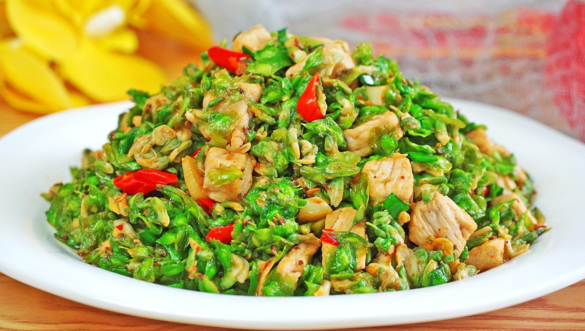 食材:榆錢、槐花、瘦肉、小米椒、大蒜、小蔥、生薑
