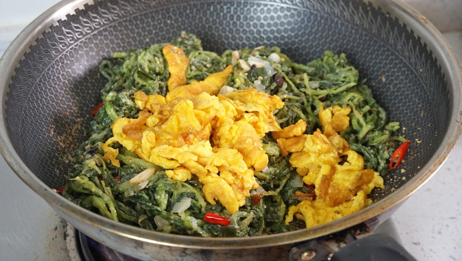 9、起鍋熱油,倒入蔥蒜小米椒爆香,再把蒸好的麪條菜倒進來,調味加鹽、雞精、生抽,最後倒入煎好的雞蛋,翻炒均勻後就可以出鍋了。