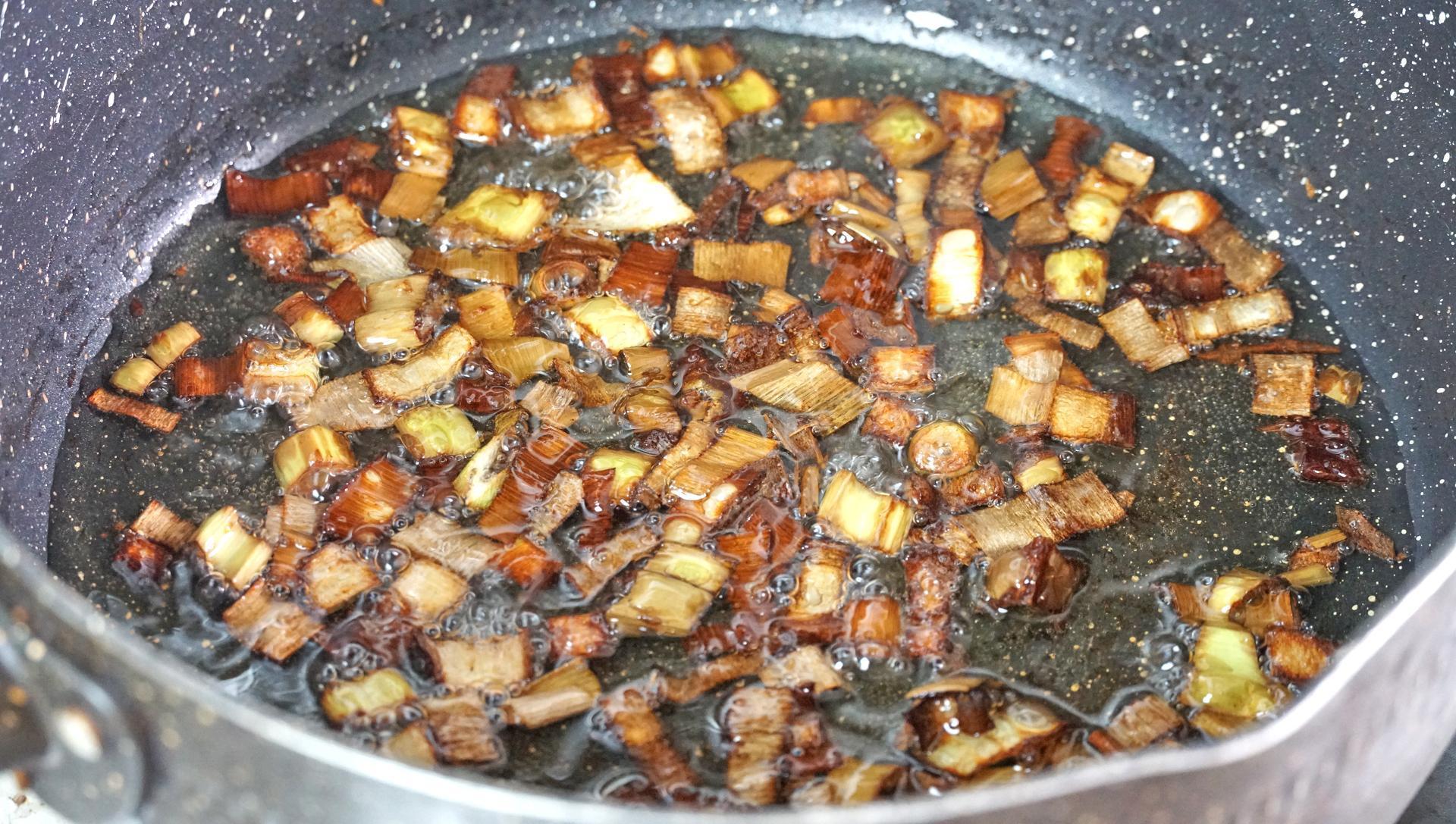 1、大蔥半根,切蔥花就可以,起鍋倒油,油熱小火煸炒蔥花,炸至微黃後關火。然後用油的餘溫把蔥花炸的更幹一下,這時候的蔥油可是超級香,炸好的蔥花放置溫熱就行。