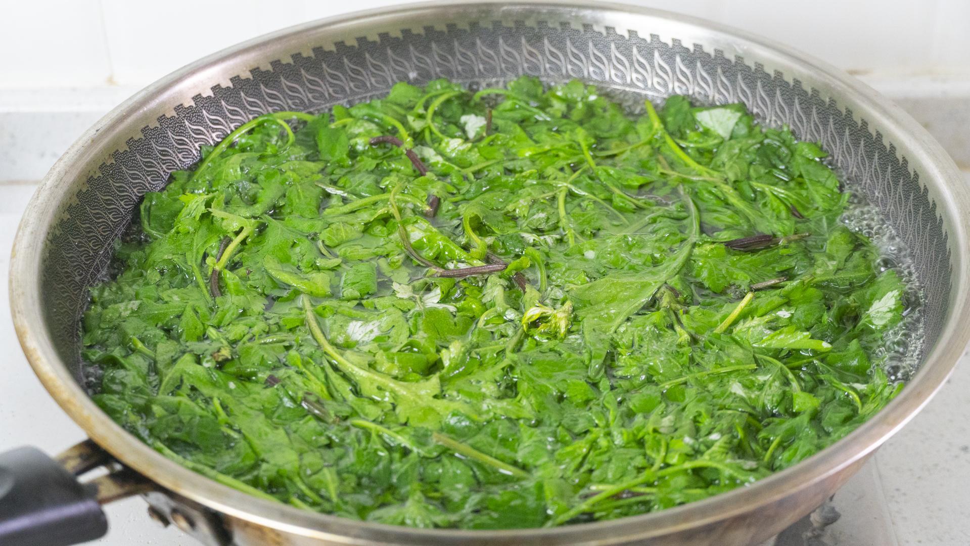 2、起鍋燒水,水開把艾草倒進來焯水,焯水的時候加5克小蘇打,大火煮3分鐘後撈出來,放到涼水中沖洗2遍,然後擠幹水分備用。