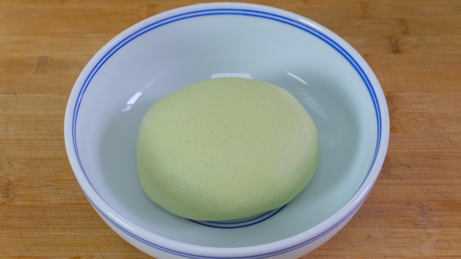 4、大碗里加300克糯米粉,250克剛剛燒開的艾草汁,攪拌均勻後下手揉麪。多揉一會兒,揉成一個偏軟的光滑細膩麪糰,揉好的麪糰兒,蓋起來,避免風乾;