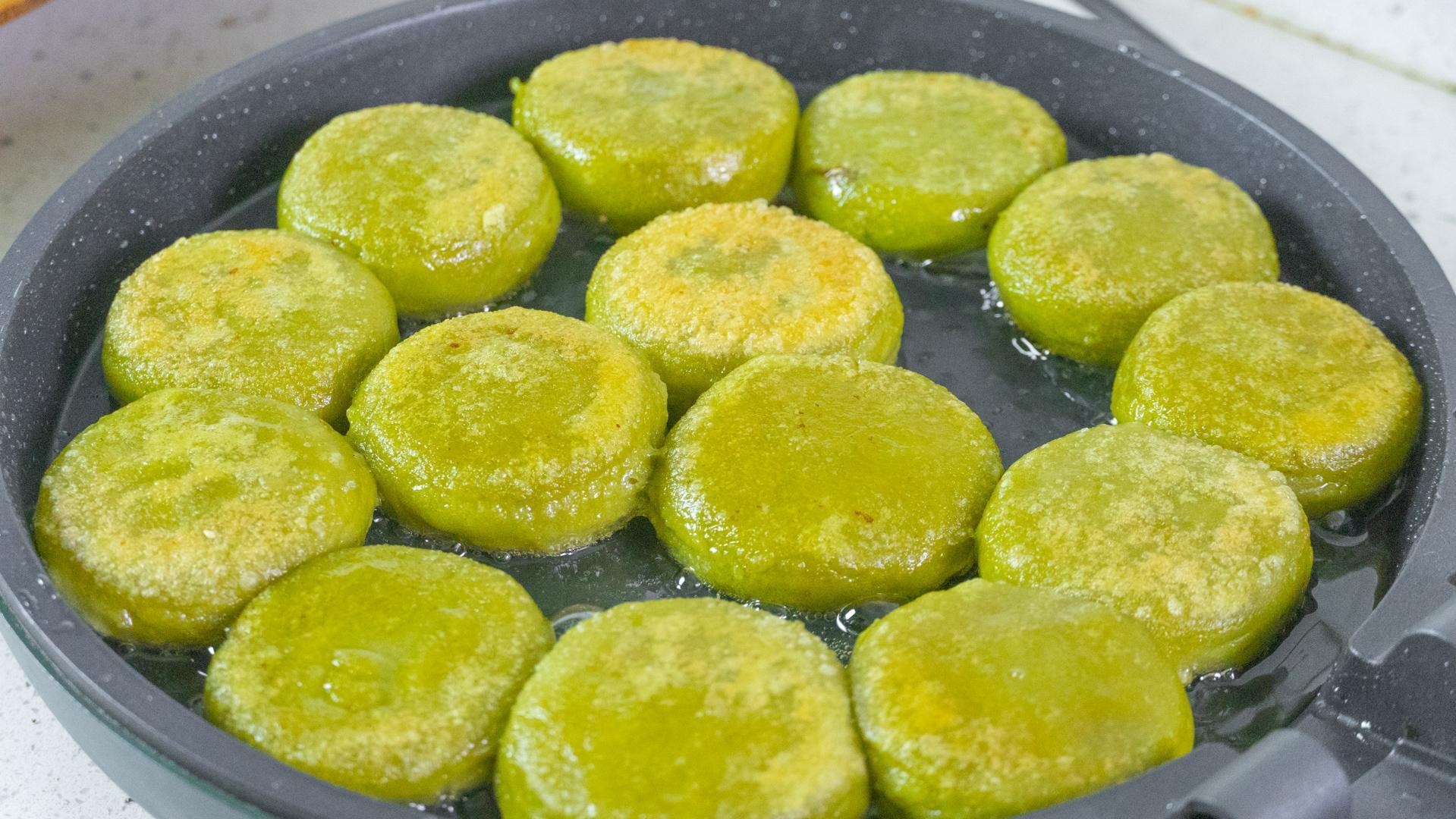 8、關火後就可以出鍋裝盤了,好喫的艾草紅糖餅就做好了。