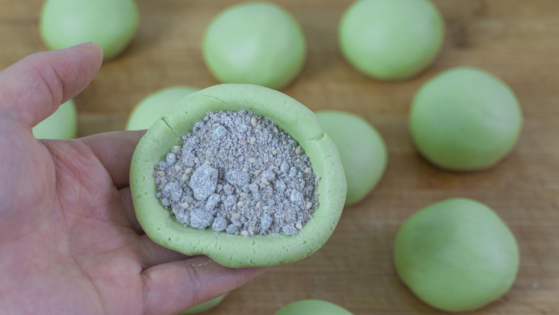 6、揉好的麪糰取出來移到砧板上,分成30克一個的小面劑子,接着揉圓。接着取一個搓圓的面劑,用拇指轉出一個窩窩形狀。舀入一大勺紅糖餡兒,放到糯米窩窩裏面,再用虎口轉圈的方式收攏,再整理一下,壓成小餅就可以了,生胚就做好了。