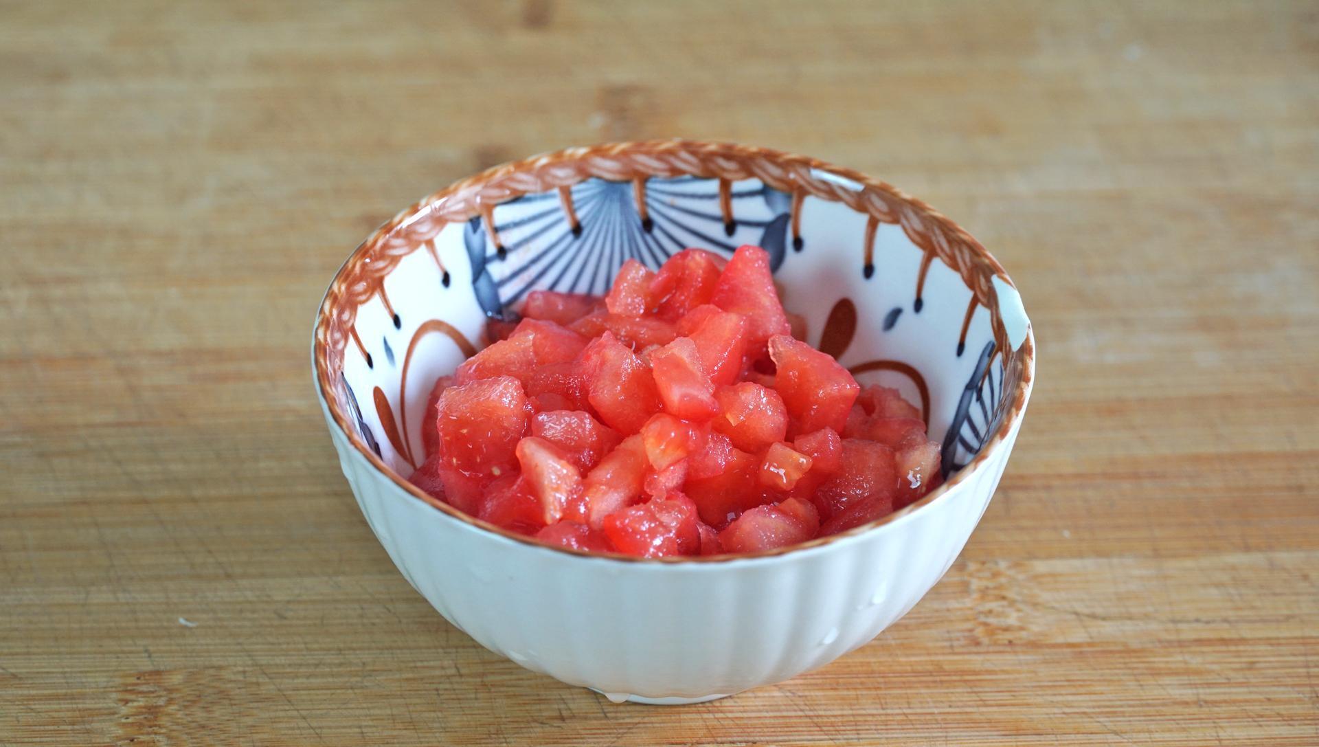 5、西紅柿1個,洗淨後劃十字花刀,然後倒入開水燙一下,接着泡10分鐘,開水燙一下後西紅柿的皮一撕就下來,接着切成小丁備用。