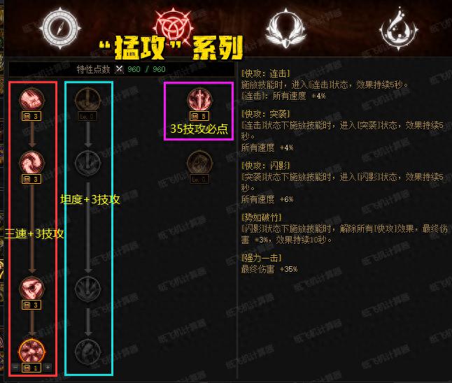 “猛攻系列”主要有2排天賦可選擇,“左1”主要增加速度和3%技攻,“左2”主要增加坦度和3%技攻;“右邊”強力一擊增加35%技攻是必點的,每個系列都有強力一擊。