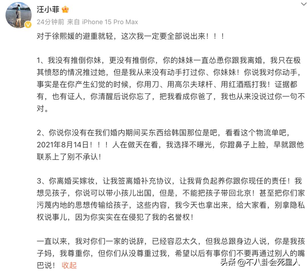 汪小菲正在臺灣打着官司呢,大S突然在微博和外網同步發佈了一篇長文,內容概括爲,第一,汪小菲動手打了小S和懷孕中的大S。