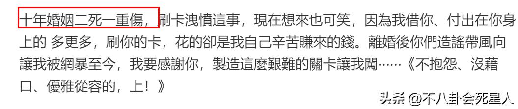 在大S的回應,有一句話讓網友們感到十分心酸。她用“十年婚姻二死一重傷”形容和汪小菲的婚姻。