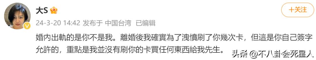 在大S媽媽回應之後,大S本人終於也罕見親自發文回應了和汪小菲的事情。
