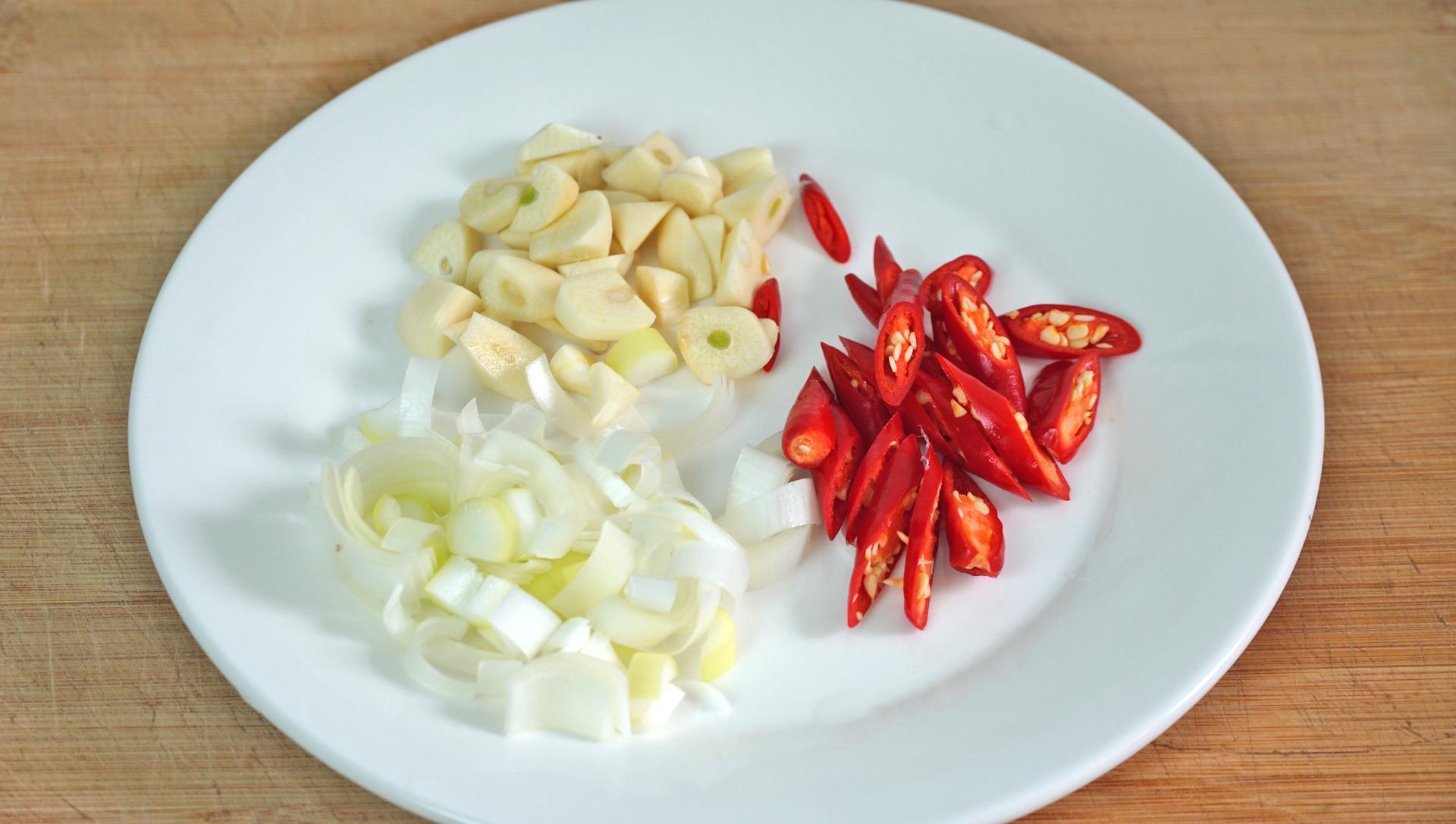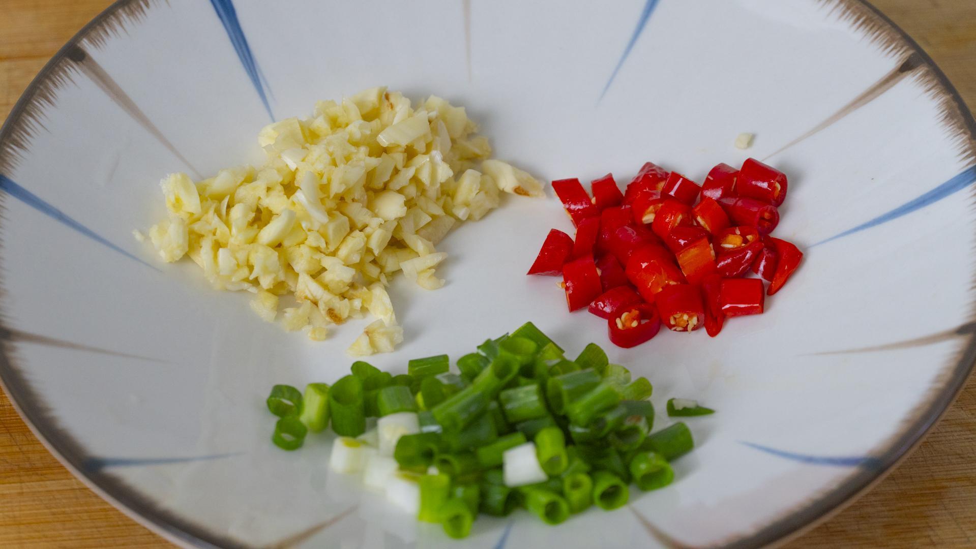 7、先切點蔥蒜和小米椒。小蔥切蔥花,大蒜切片,小米椒切圈圈。