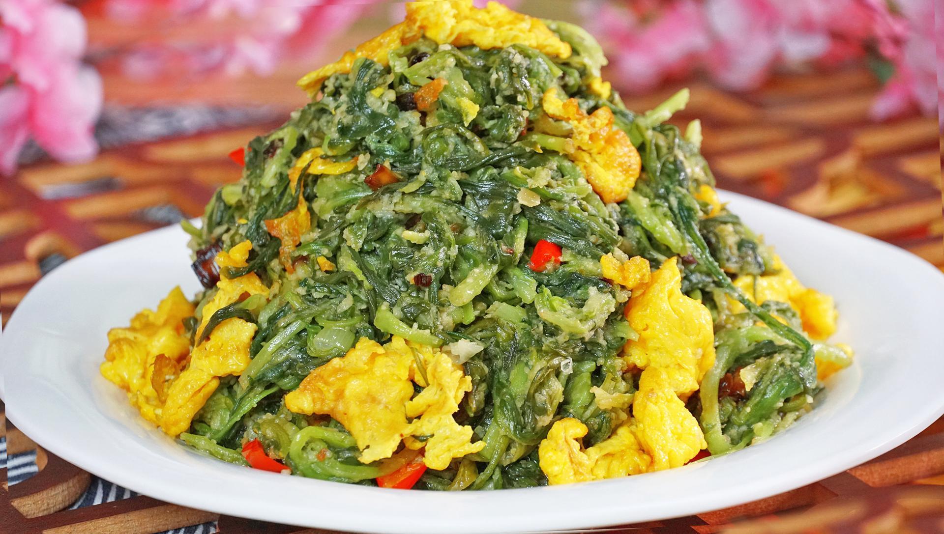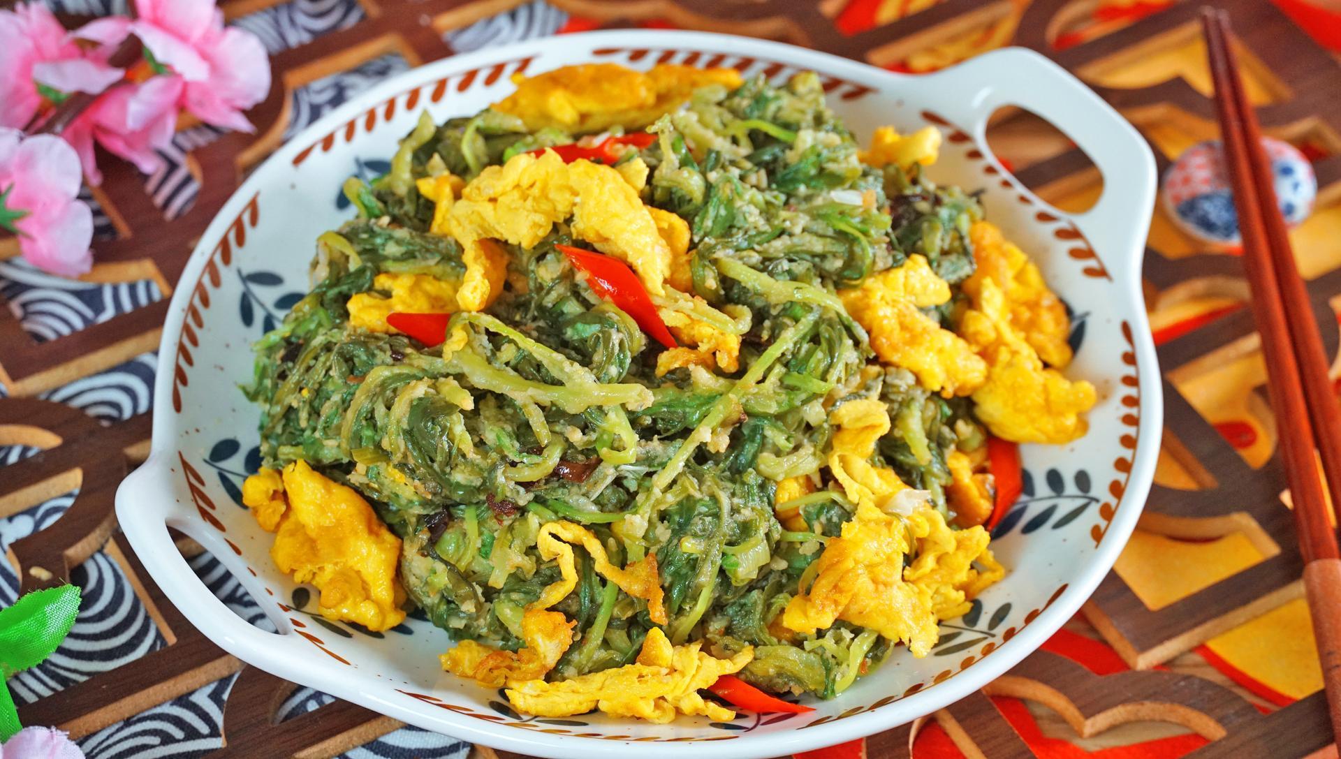 食材:豌豆芽、雞蛋、胡蘿蔔、大蒜、小米椒、蔥花