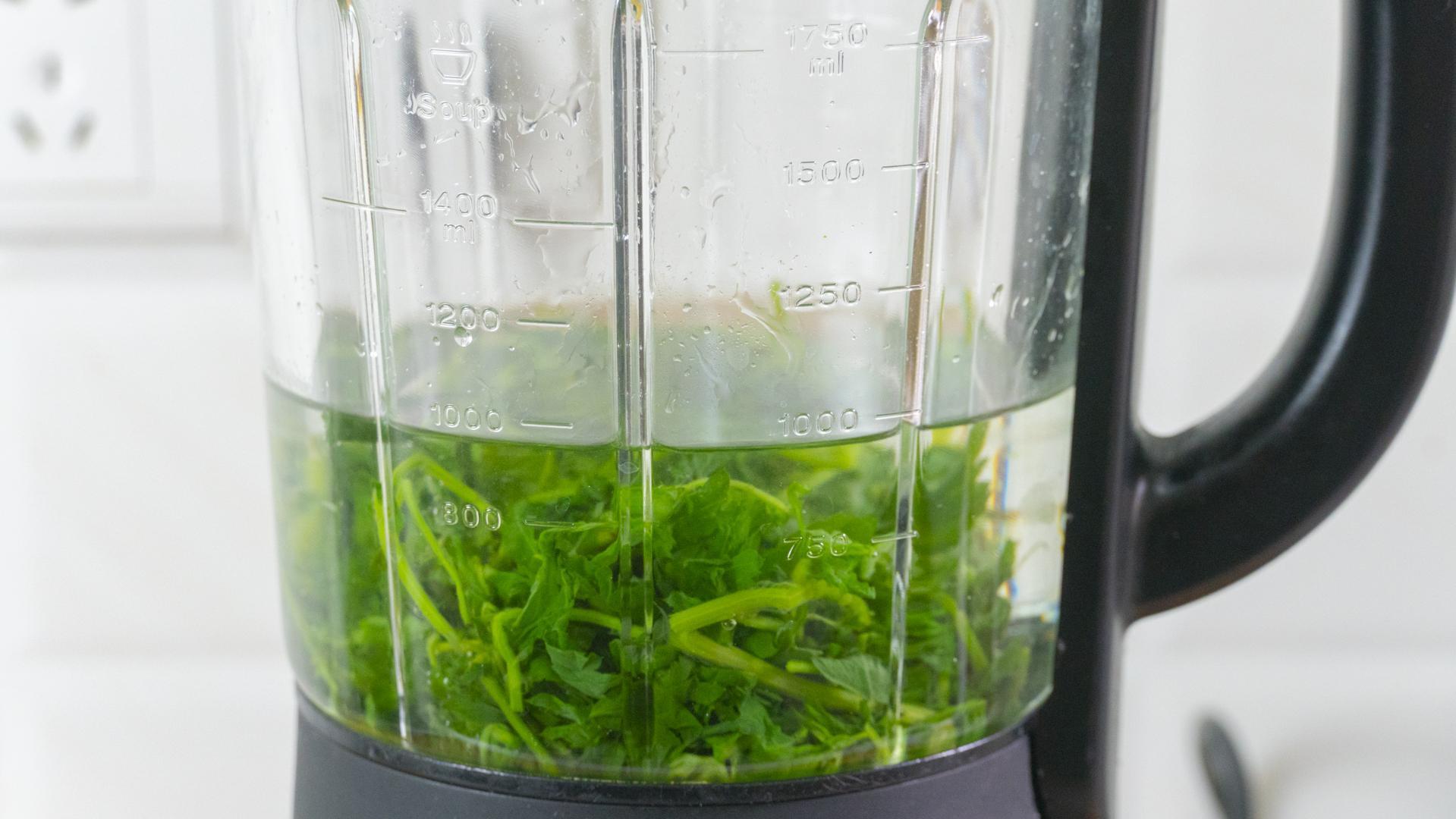 3、擠幹水分的艾草放入破壁機,再加適量清水打成細膩的艾草汁,倒出來的時候過濾一下,做好的艾草汁倒入鍋中,大火煮開,煮到沸騰後就可以關火揉麪了。