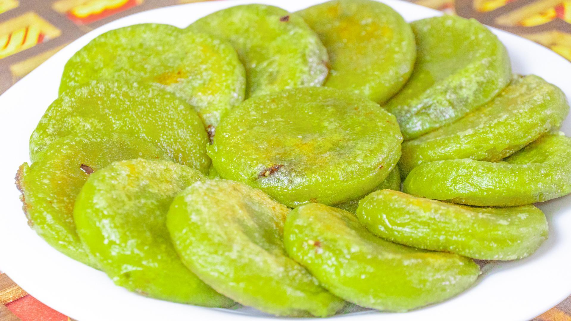 8、關火後就可以出鍋裝盤了,好喫的艾草紅糖餅就做好了。