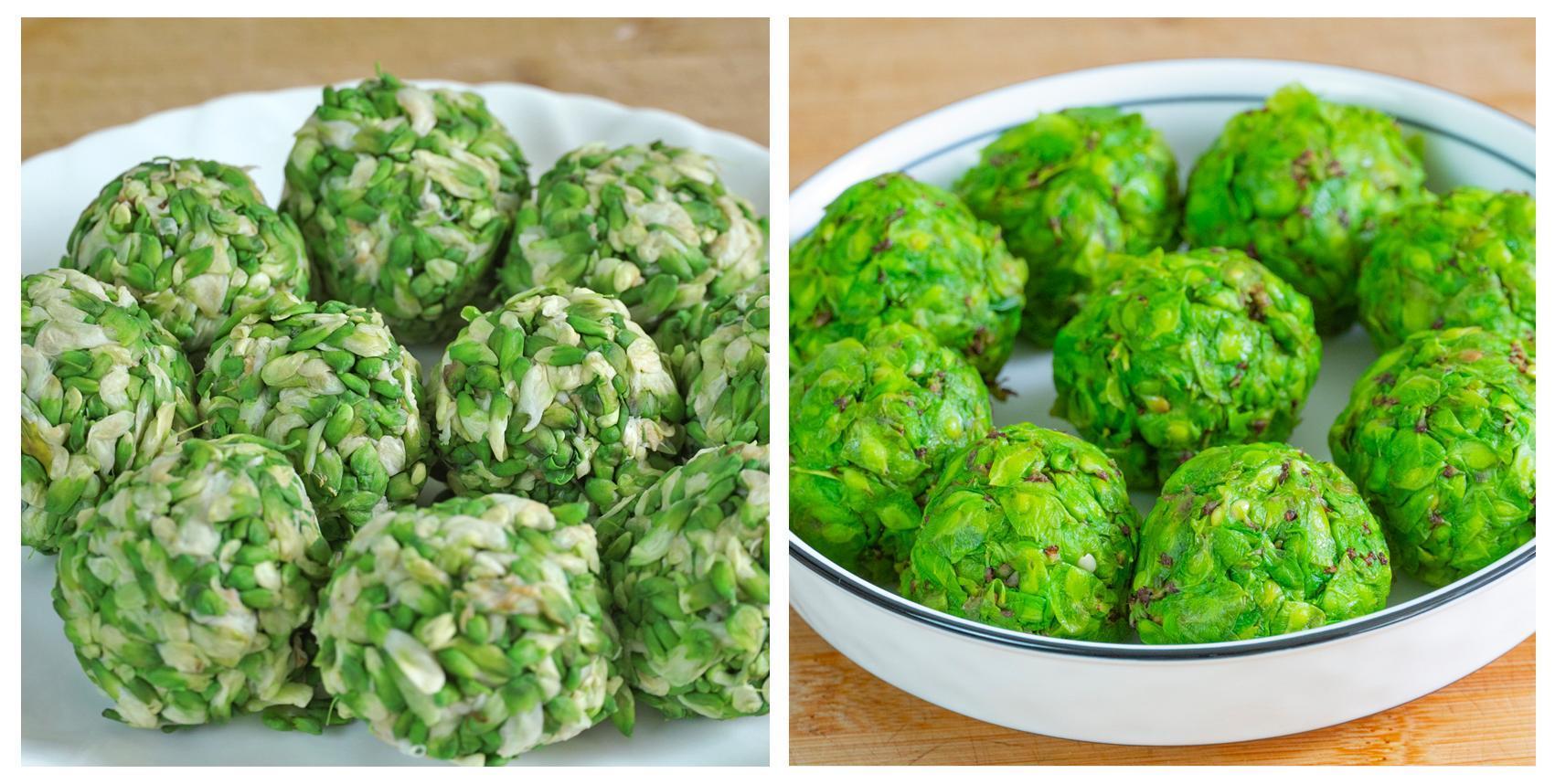 2、起鍋燒水,水開倒入榆錢焯水。大火燙1分鐘就可以撈出來了,然後過一遍涼水降溫,接着擠幹水分。槐花也是同樣的操作,水開倒入鍋中焯水,大火10秒就夠了,然後撈出來過一遍涼水後擠幹水分備用。
