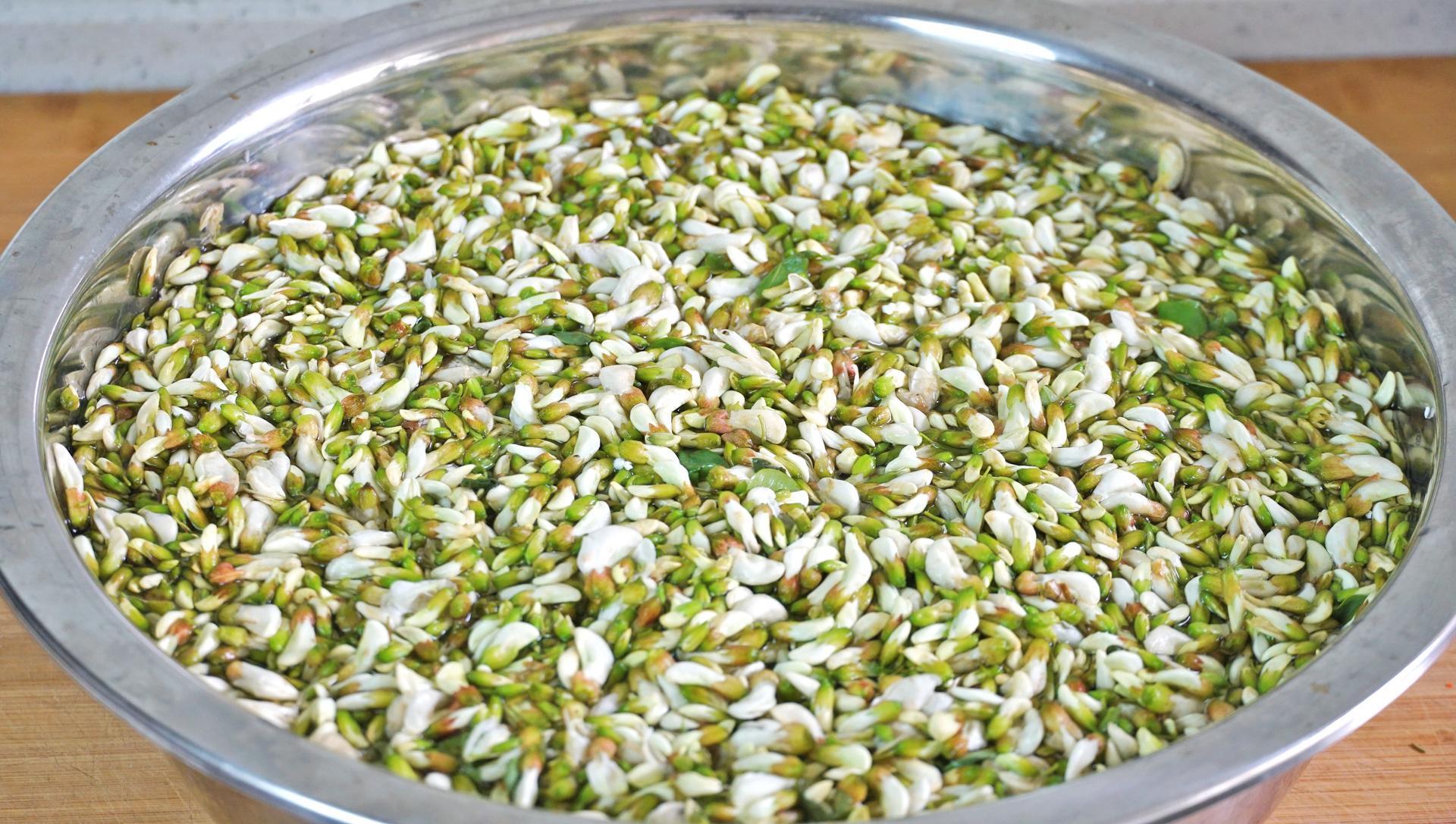 2、起鍋燒水,水開加一勺鹽,然後倒入槐花焯水,大火燙10秒後立馬撈出。過一下涼水降溫,然後擠幹水分,注意不要擠太乾,水分以不滴水就可以。