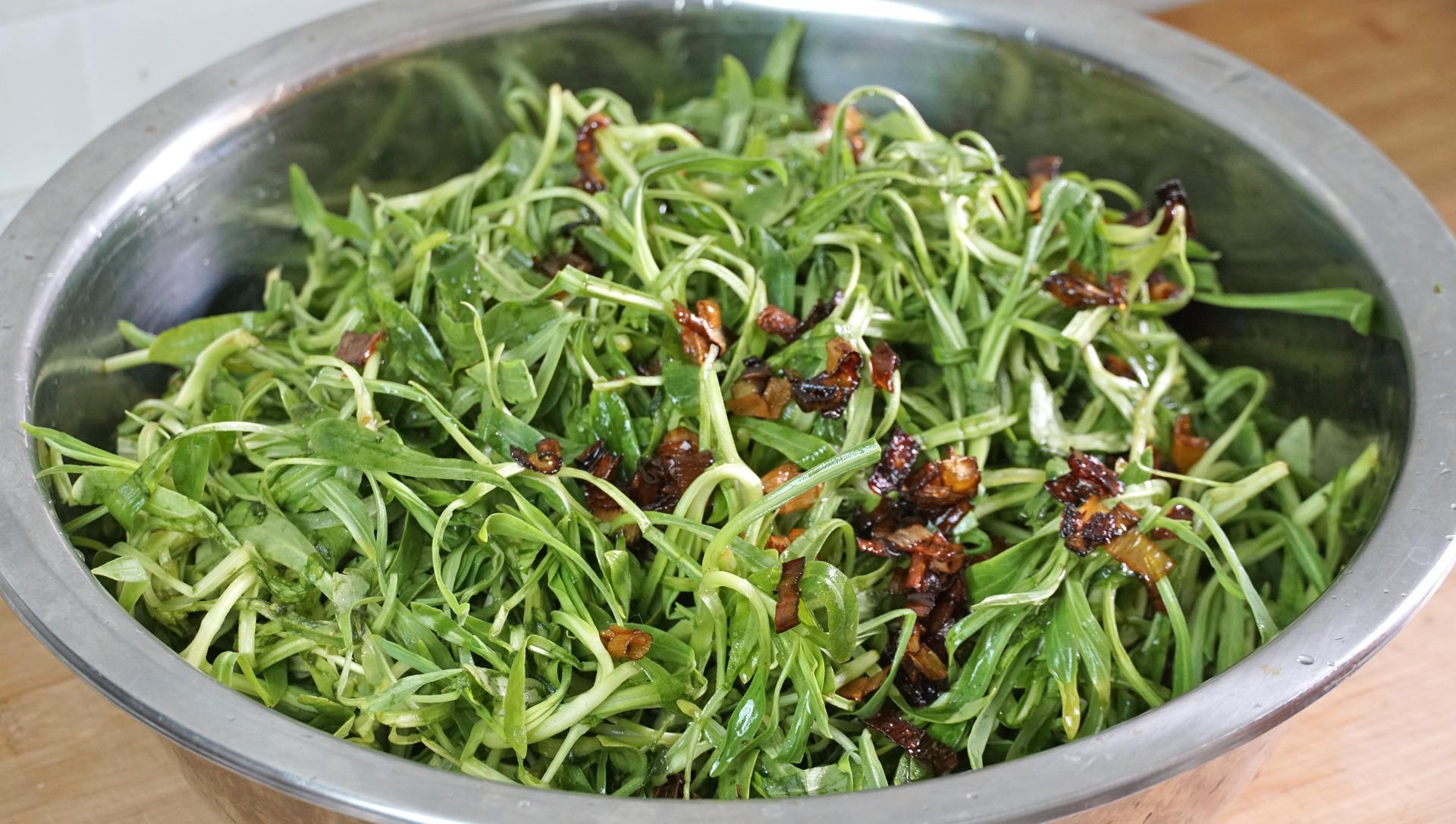 3、接着把麪條菜裝入大碗裏,再把炸好的蔥油和蔥花都倒進來,用筷子拌勻。
