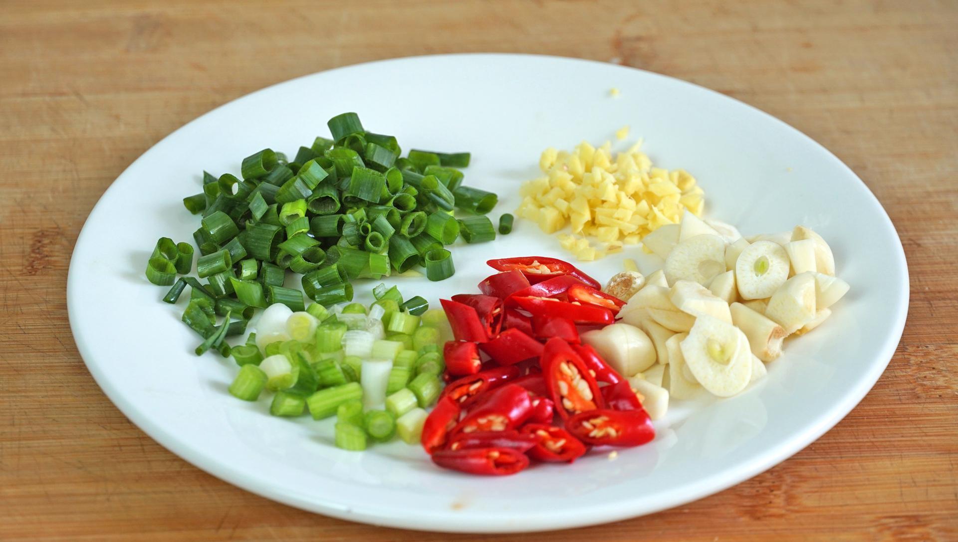 5、先切點蔥薑蒜小米椒,小蔥切蔥花,生薑切末,大蒜切片,小米椒切圈圈。