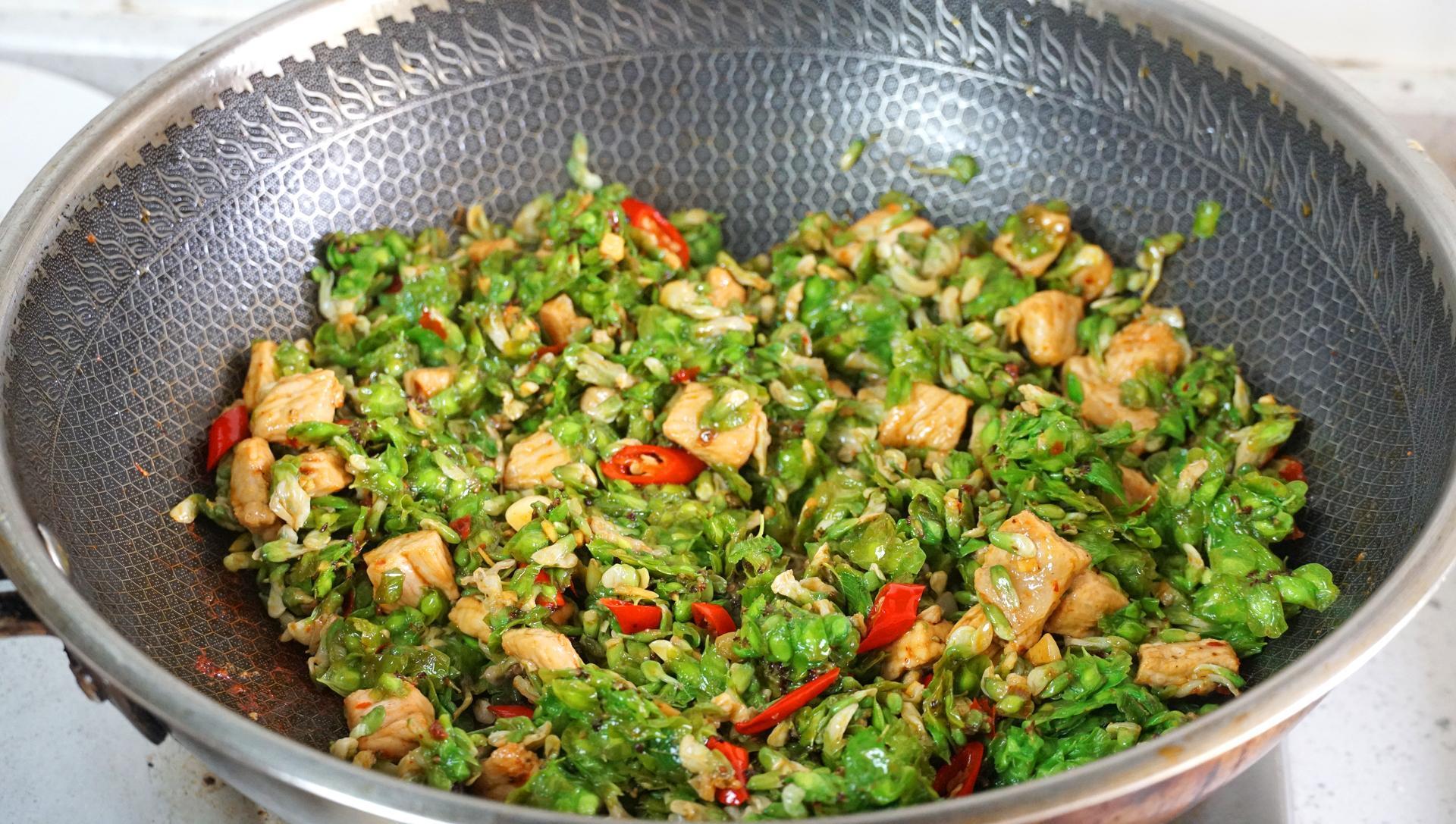 6、起鍋倒油,油熱先下肉丁,大火翻炒至變色,接着加蔥薑蒜小米椒爆香,出香味兒後再加一勺豆瓣醬炒出紅油,最後倒入燙熟的榆錢和槐花,調味加鹽、糖、雞精、生抽、翻拌均勻後就可以出鍋了。