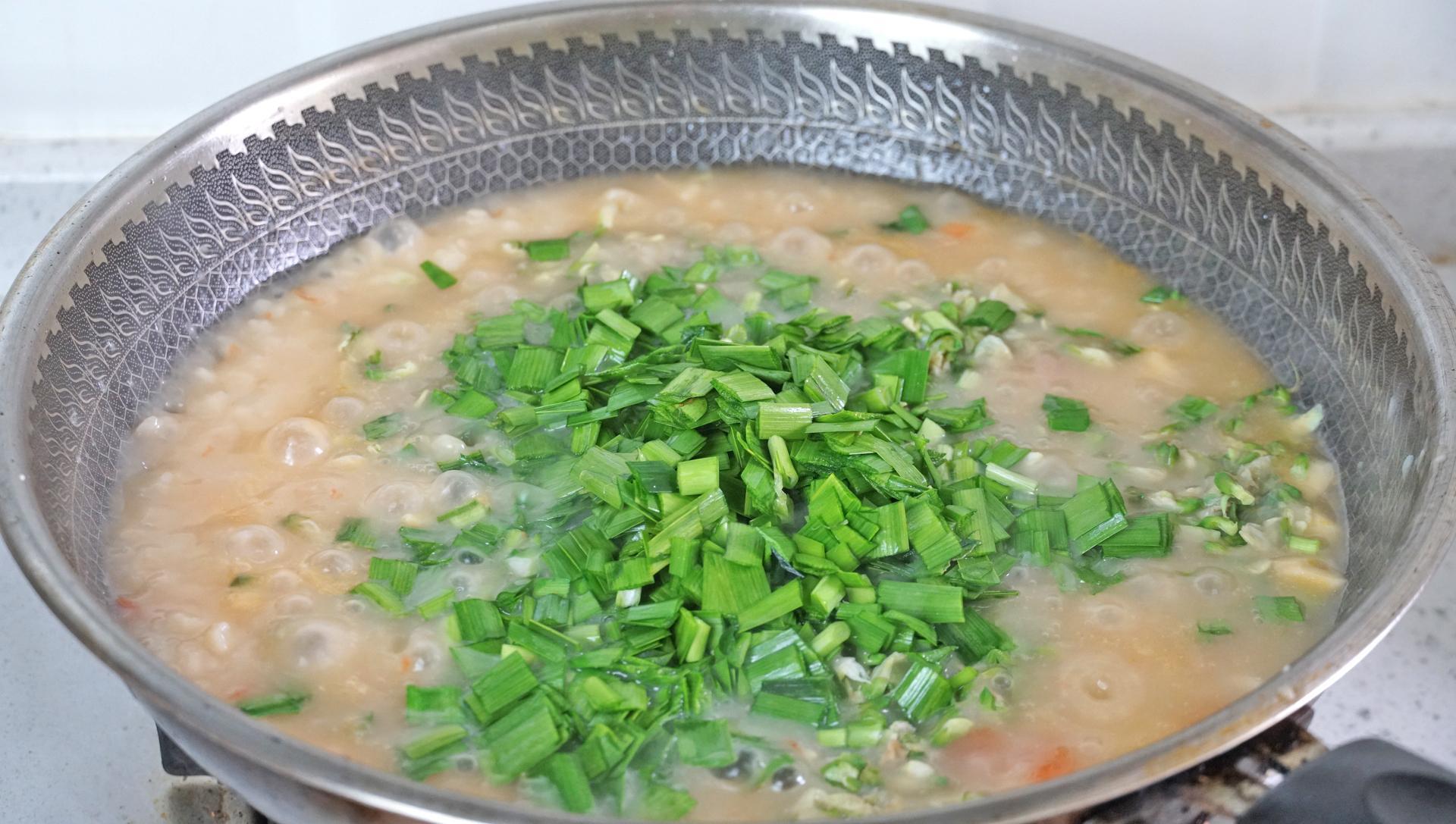 8、然後繼續煮5分鐘,麪疙瘩煮熟後加一勺鹽、一勺雞精、一勺生抽,最後倒入槐花和韭菜,再來一勺香油,一把枸杞拌勻後就可以出鍋了。