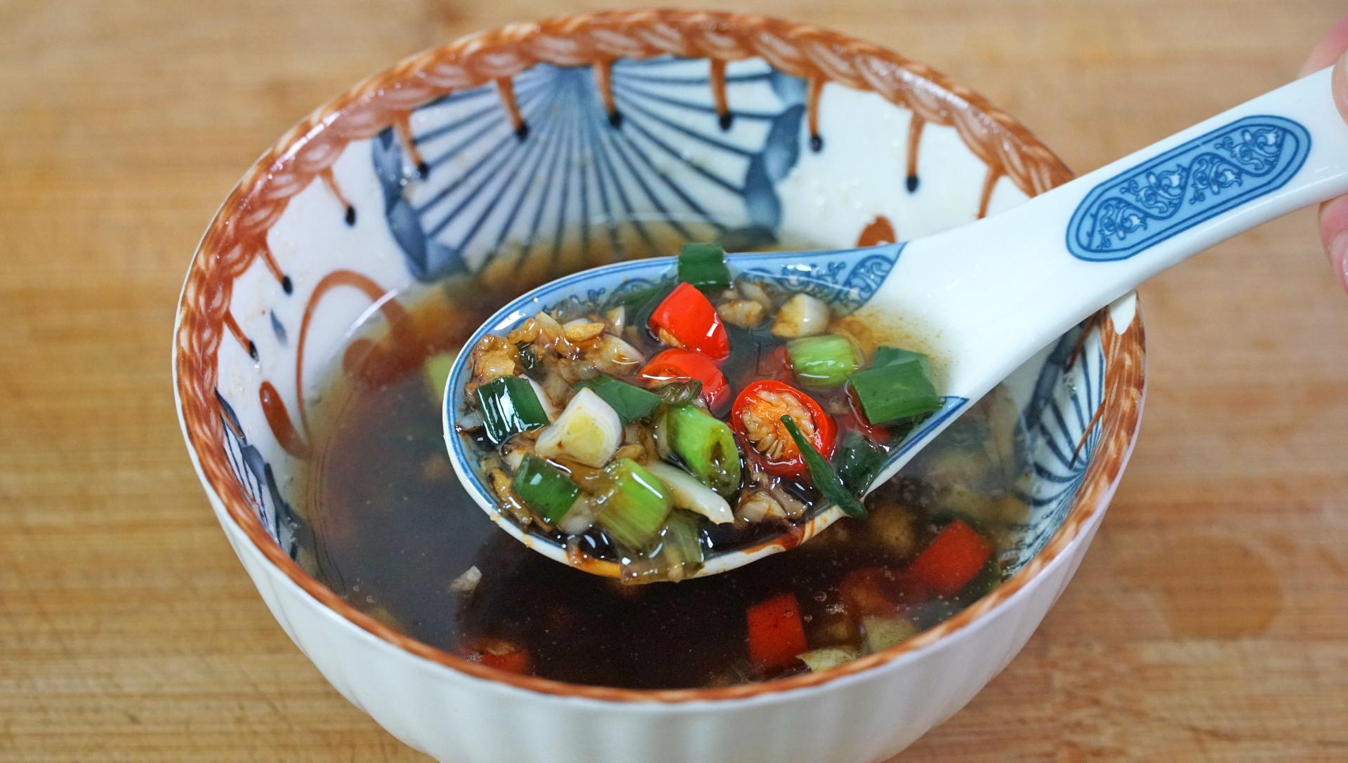 8、蒸糰子的時間來做個蘸料,碗里加蒜末、小米椒、蔥花,熱油。激發出香味兒後再加香醋、生抽、鹽、雞精、白糖,拌勻後就可以了;