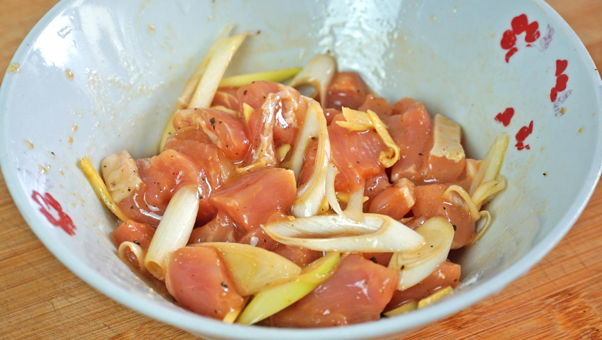 4、豬瘦肉1小塊,清洗乾淨後切成丁,裝入碗裏後加薑絲、大蔥、料酒去腥,鹽、生抽、胡椒粉、澱粉入底味兒,加一勺食用油後抓拌均勻醃製15分鐘,醃好後挑出生薑和大蔥就行。