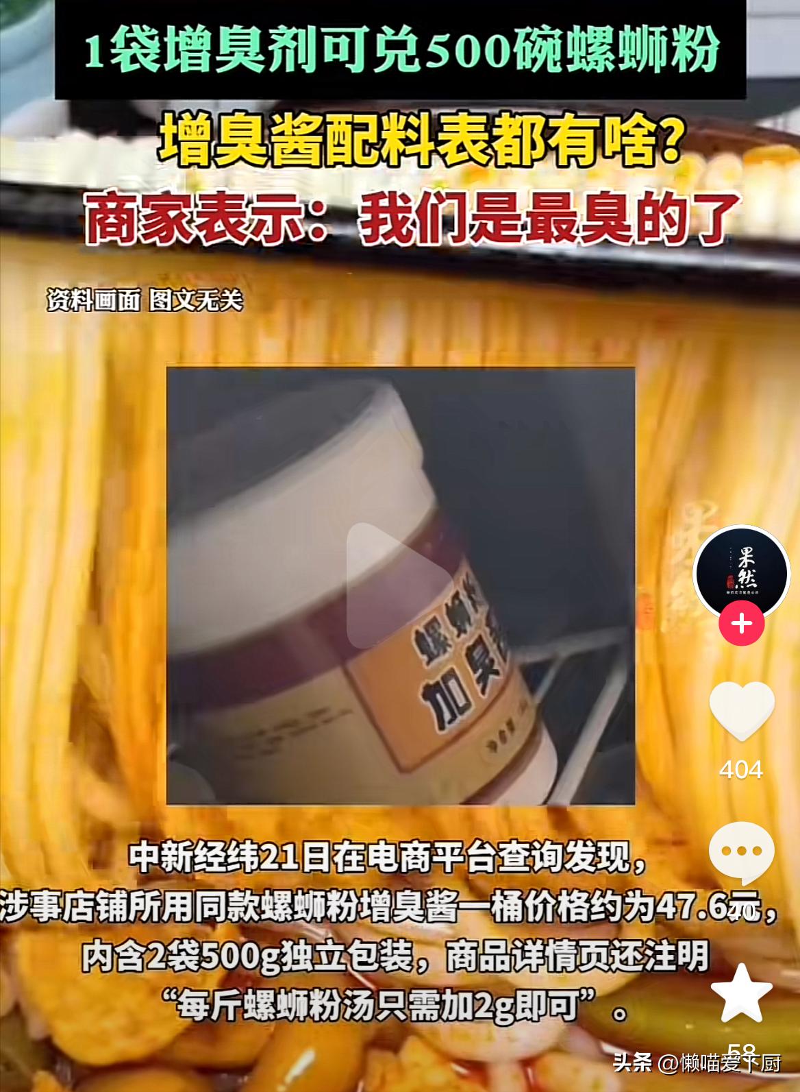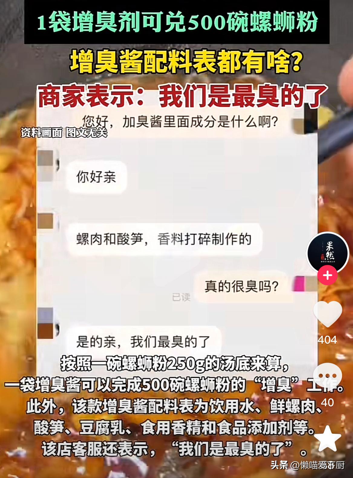 315過後,有媒體對“螺螄粉增臭劑”進行了調查,發現該店鋪用的增臭劑,在電商平臺上有售賣,一袋增臭劑可以兌500碗螺螄粉。店鋪客服還強調,“我們最臭的了”。