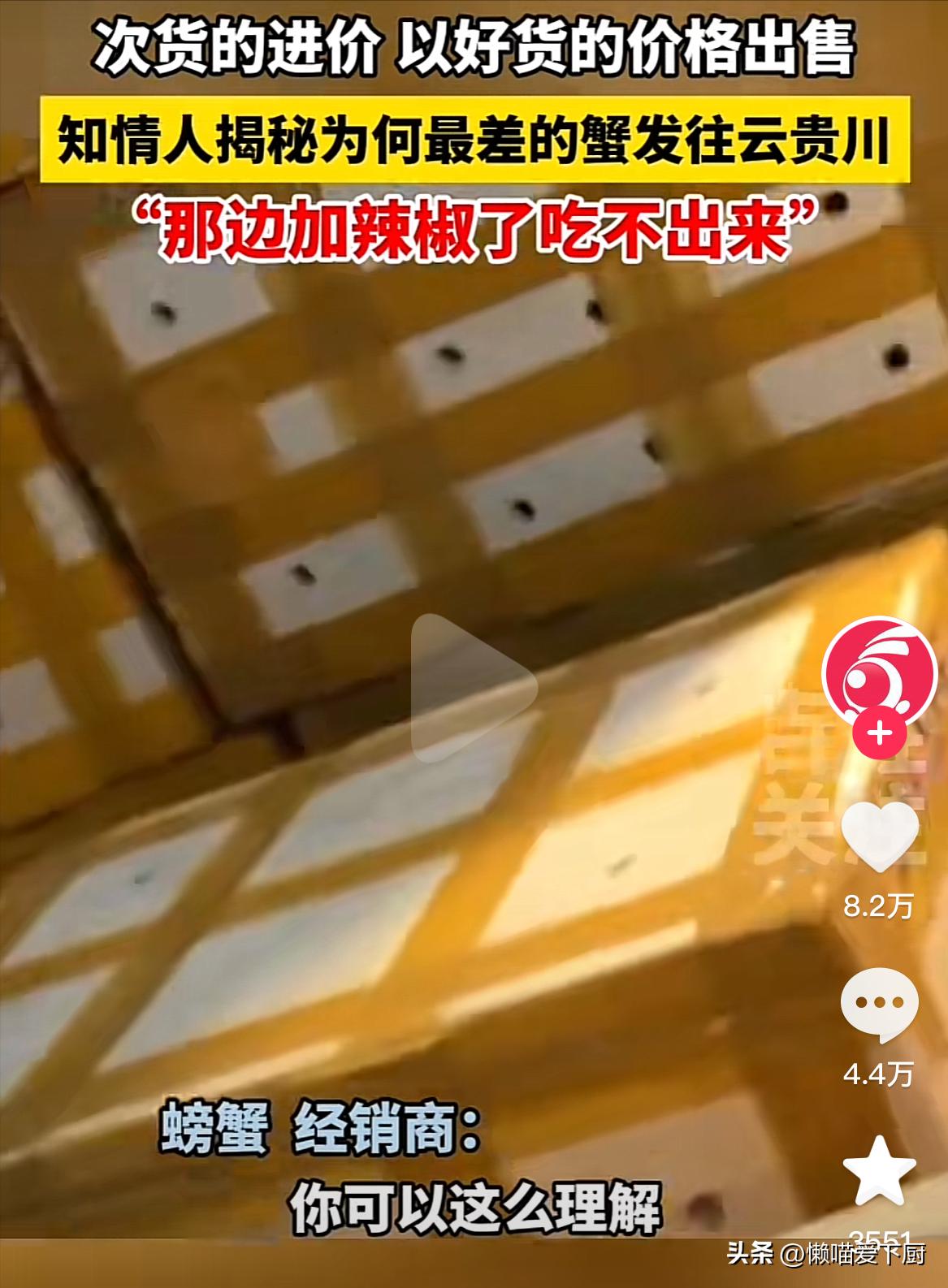 記者從知情人口中瞭解到,南方地區人們習慣清蒸螃蟹,很容易喫出螃蟹是否新鮮,而云貴川地區的人們,習慣加辣椒、蠔油來烹製螃蟹,在重口味的掩蓋下,很難喫出不同品質螃蟹的區別。