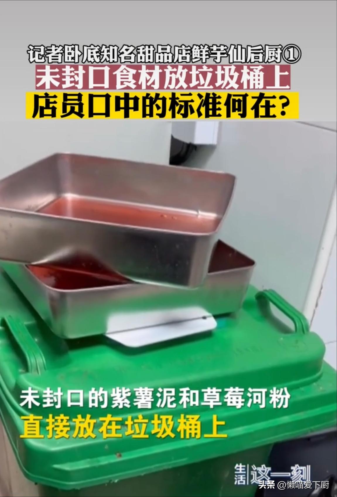 記者在北京兩家鮮芋仙門店暗訪時,發現未封口的配料隨意放在垃圾桶上,同一塊抹布又擦牆、又擦櫃子、又擦盆。