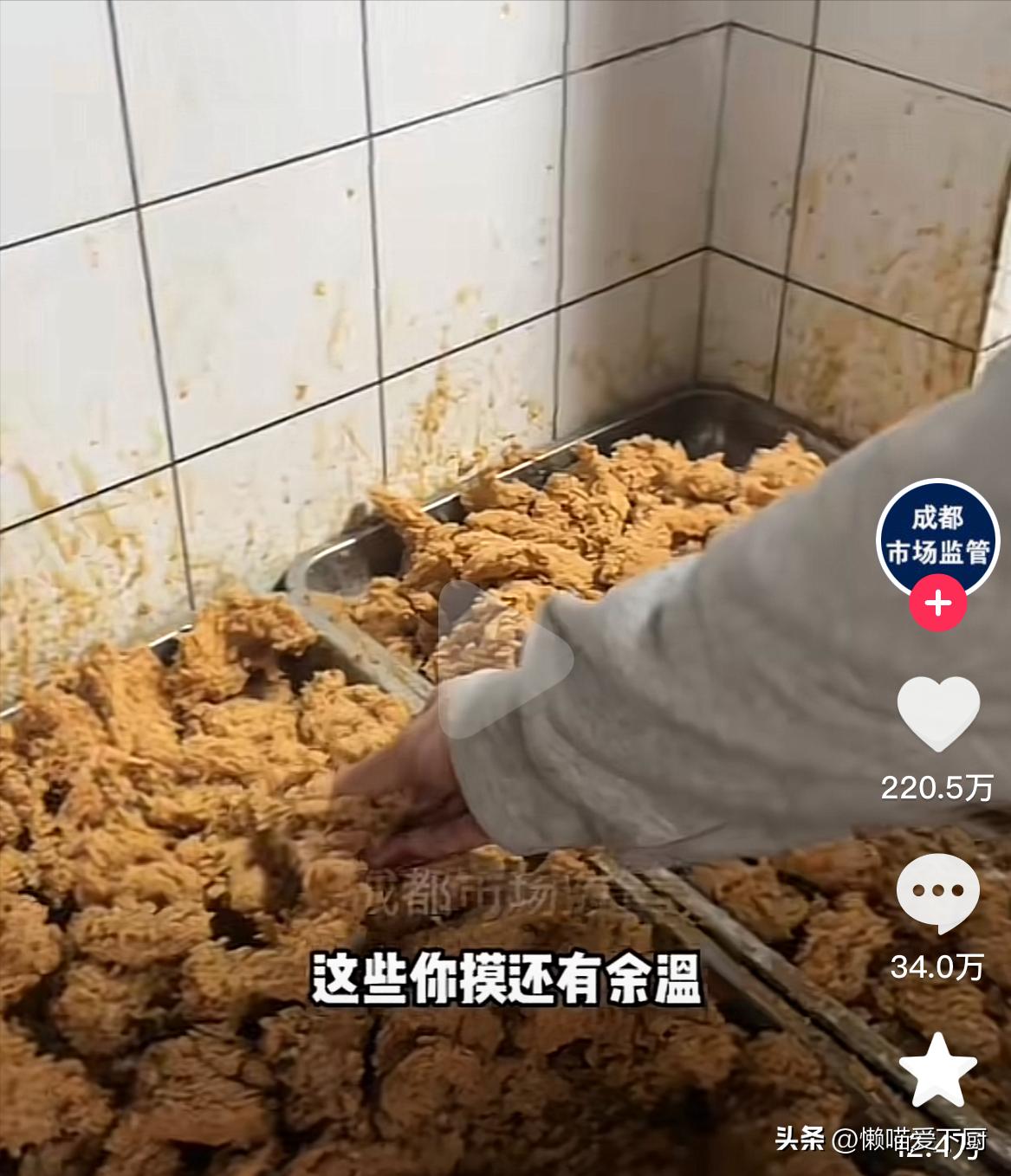 而當工作人員問店員,檯面上擺放的一盤盤炸雞,是什麼時候做的,店員竟然裸手抓起一塊炸雞,說是剛剛炸的。