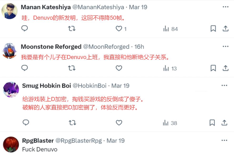 “抵制內鬼”的想法聽起來義正辭嚴,但從相關新聞的評論區不難看出,國內外玩家對這項技術的態度多是消極和抵制:有D加密影響遊戲性能的“珠玉在前”,即便Denuvo表示水印技術不會影響遊戲質量,國內外玩家依舊擔心要由自己的遊戲體驗來爲廠商們的安全措施買單。