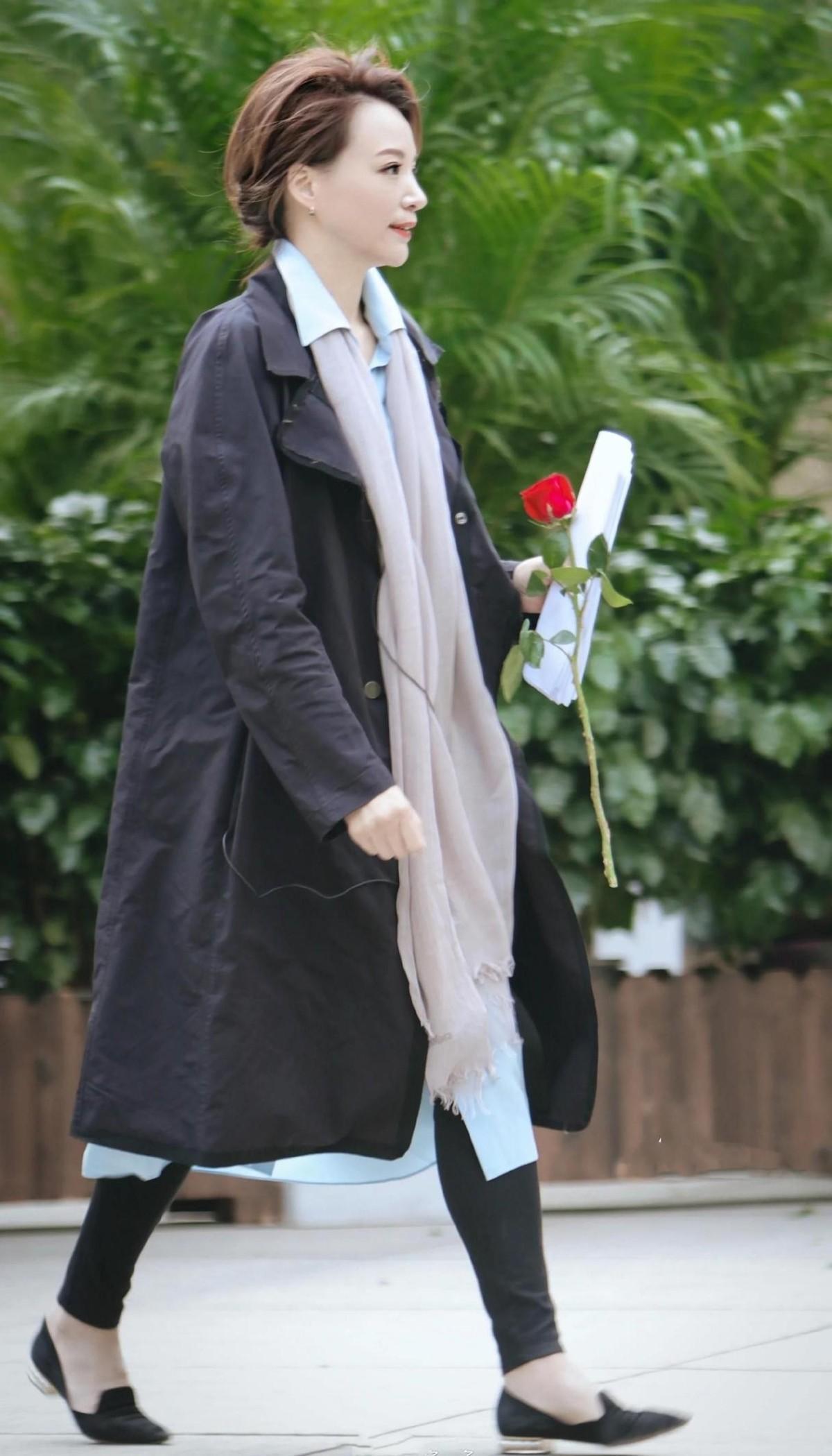 一件黑色的長款風衣很適合董卿高挑的身材,脖子上絲綢圍巾點綴了整個造型,可以讓整體搭配更顯優雅。內搭的襯衫豐富了層次感,掩蓋了風衣臃腫寬大的缺點,讓整體的搭配更加的完美。