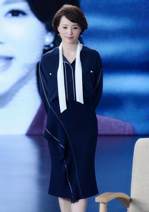 這樣的休閒西裝如何選擇內搭呢?大家可以參考董卿的藍色高領毛衣。藍色本來就是溫柔的顏色,和西裝搭配在一起也不會覺得突兀,和西裝的藍色條紋還能相互呼應。本身的短髮造型就讓脖子顯得很修長,高領毛衣更加優化了頸部線條,真是一箭雙鵰!