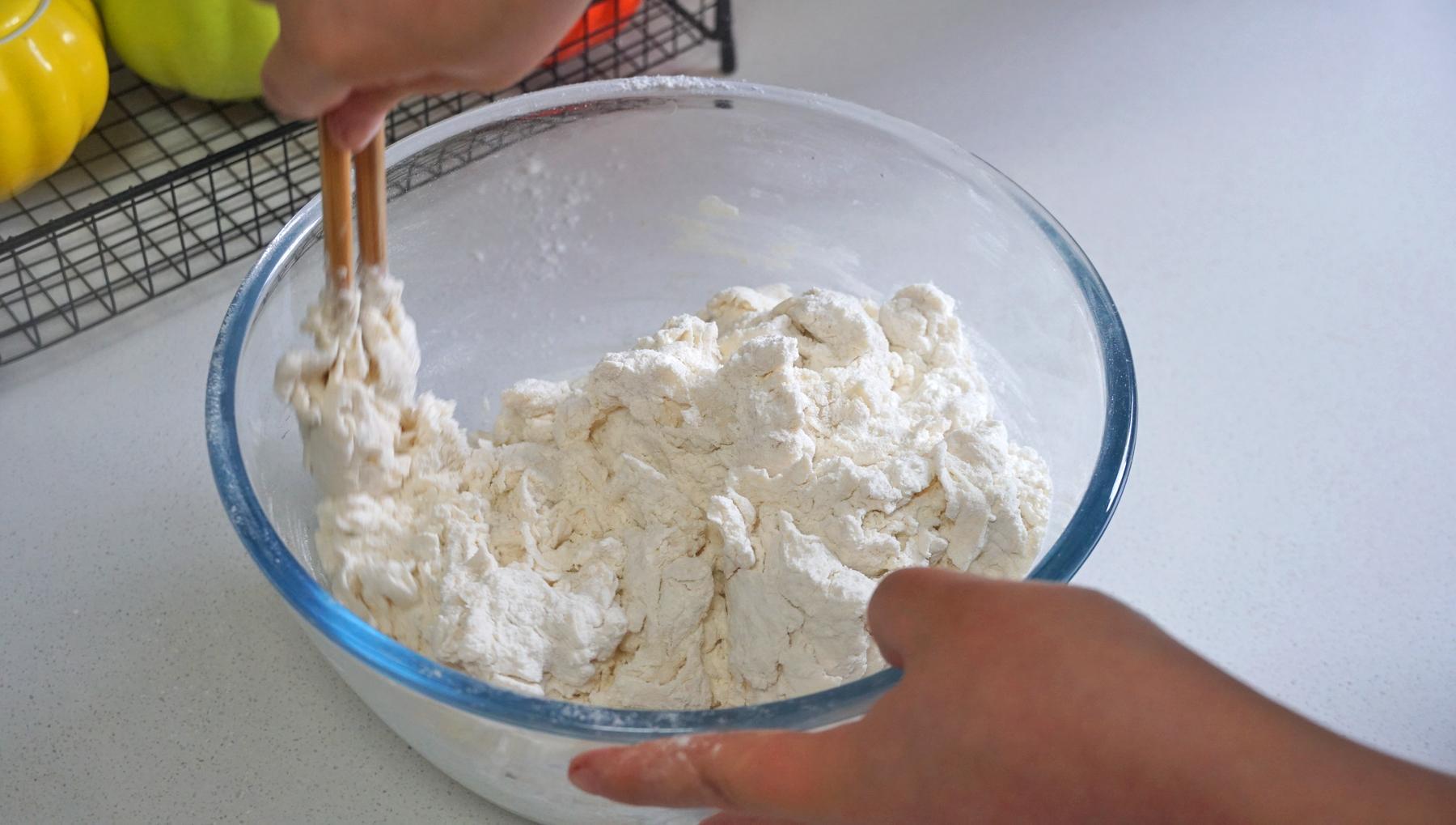 先來揉麪,600克麪粉裏面我加了5克白糖、5克酵母、300克清水,攪拌一下,
