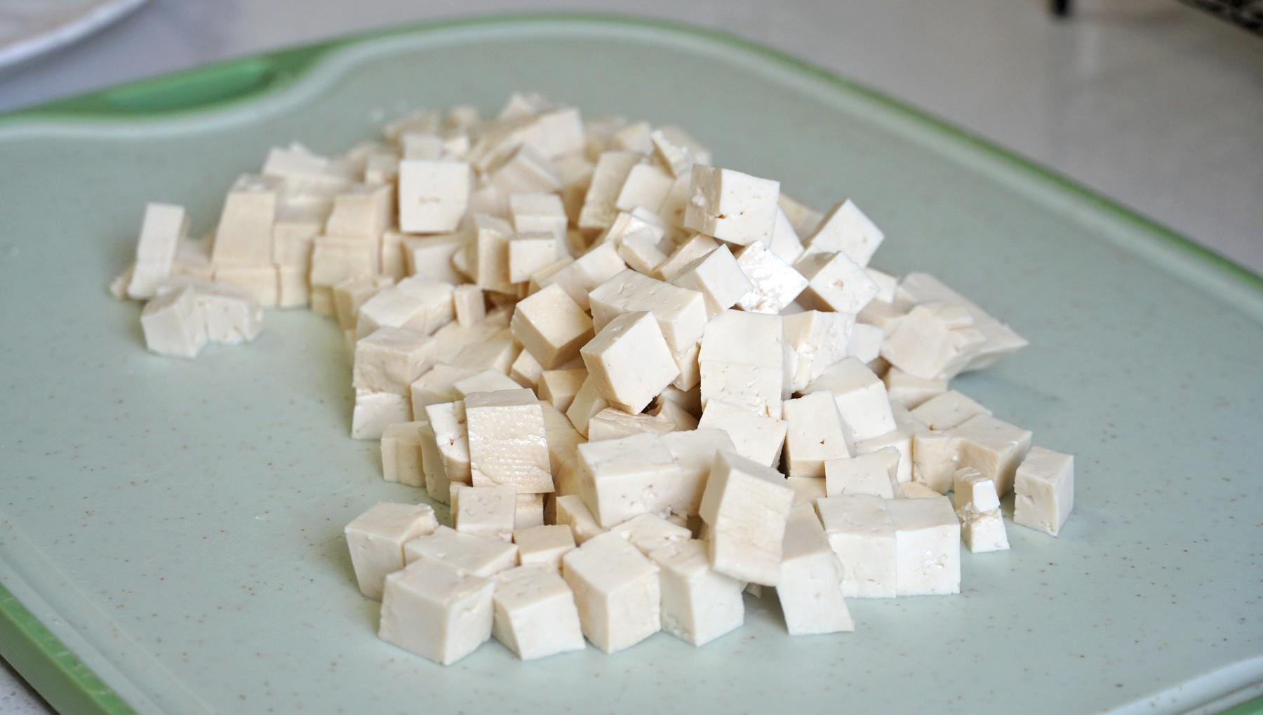 1、平常做花捲就是加了一點蔥花,今天準備包點餡兒,喫起來應該會更香,我用了一塊兒老豆腐,切一切,切成這種小丁就好了;