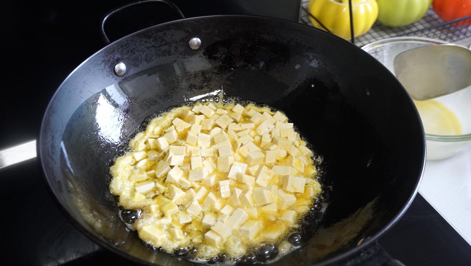 5、現在來把餡兒炒一下,油熱了就把豆腐倒進來,先煎一煎,蛋液凝固了就給它翻動一下,炒一下,