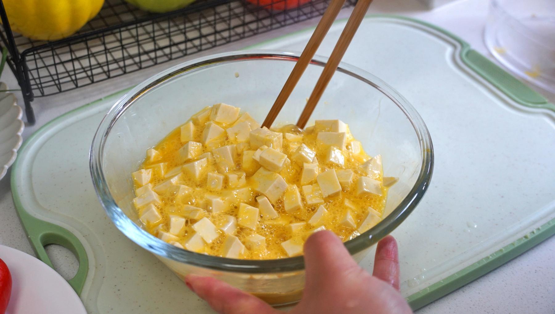 3、然後直接倒進豆腐進來,給它拌一下,讓豆腐裏面都裹上一層蛋液;