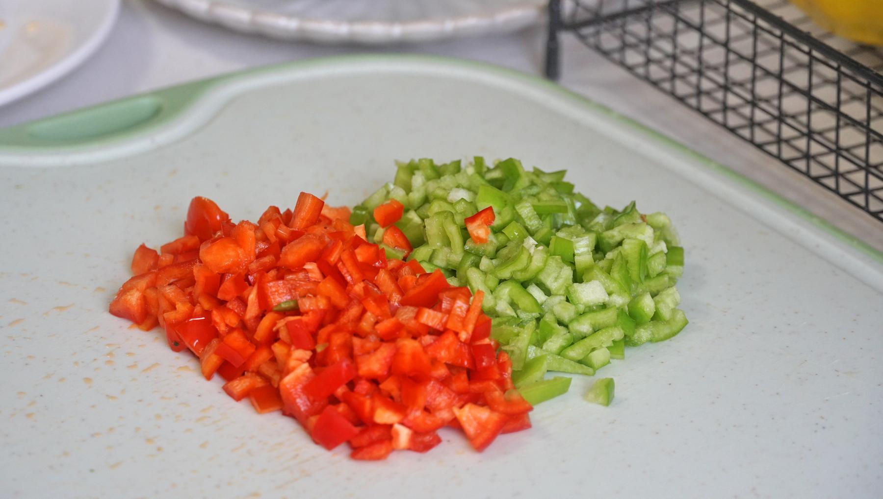 4、再切點蔥花和青紅辣椒丁,我這裏是一把小香蔥,用來攤雞蛋是最香了,青紅辣椒各用了一個,都是不辣的;