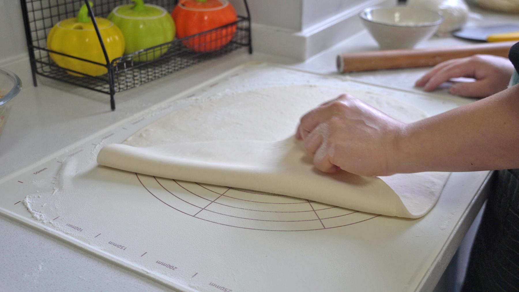 2、墊子有點小,我是分了兩份,擀成這種厚一點的大面片,再把餡兒倒進來,