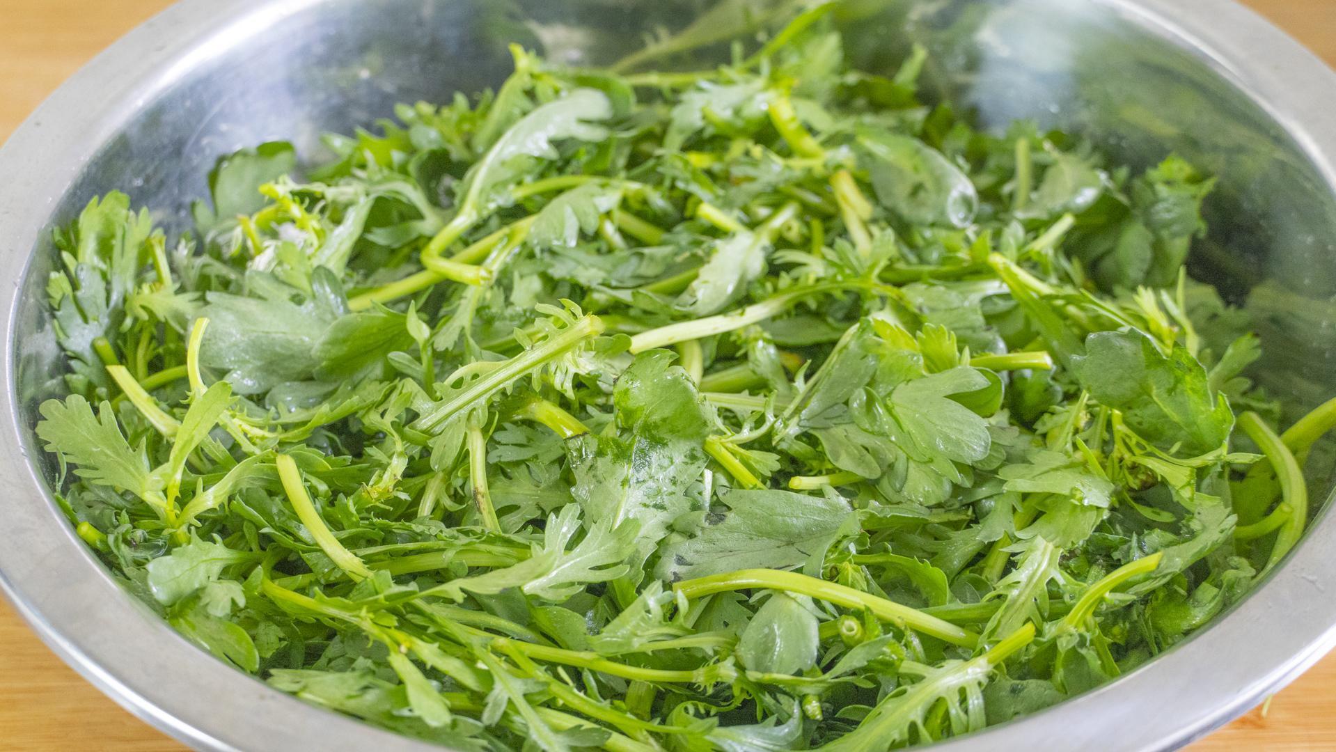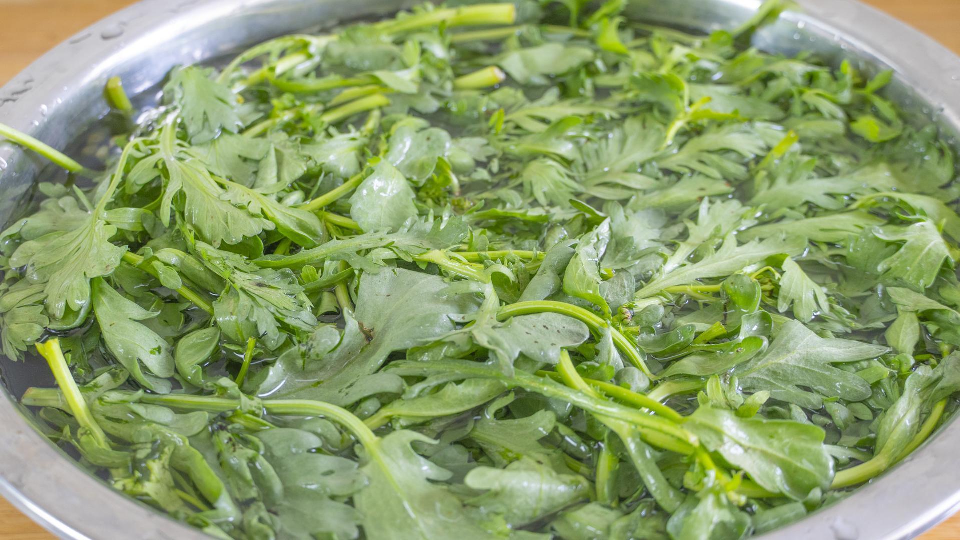 1、茼蒿一把,清洗好後再放在盆裏,加淡鹽水浸半個小時,可以有效的清除茼蒿中所含有的農藥化合物,浸泡好後撈出來晾一晾水分,接着切成小段兒。