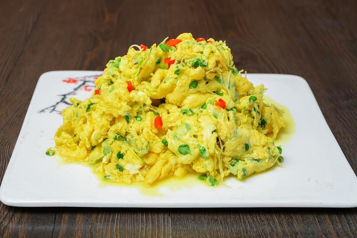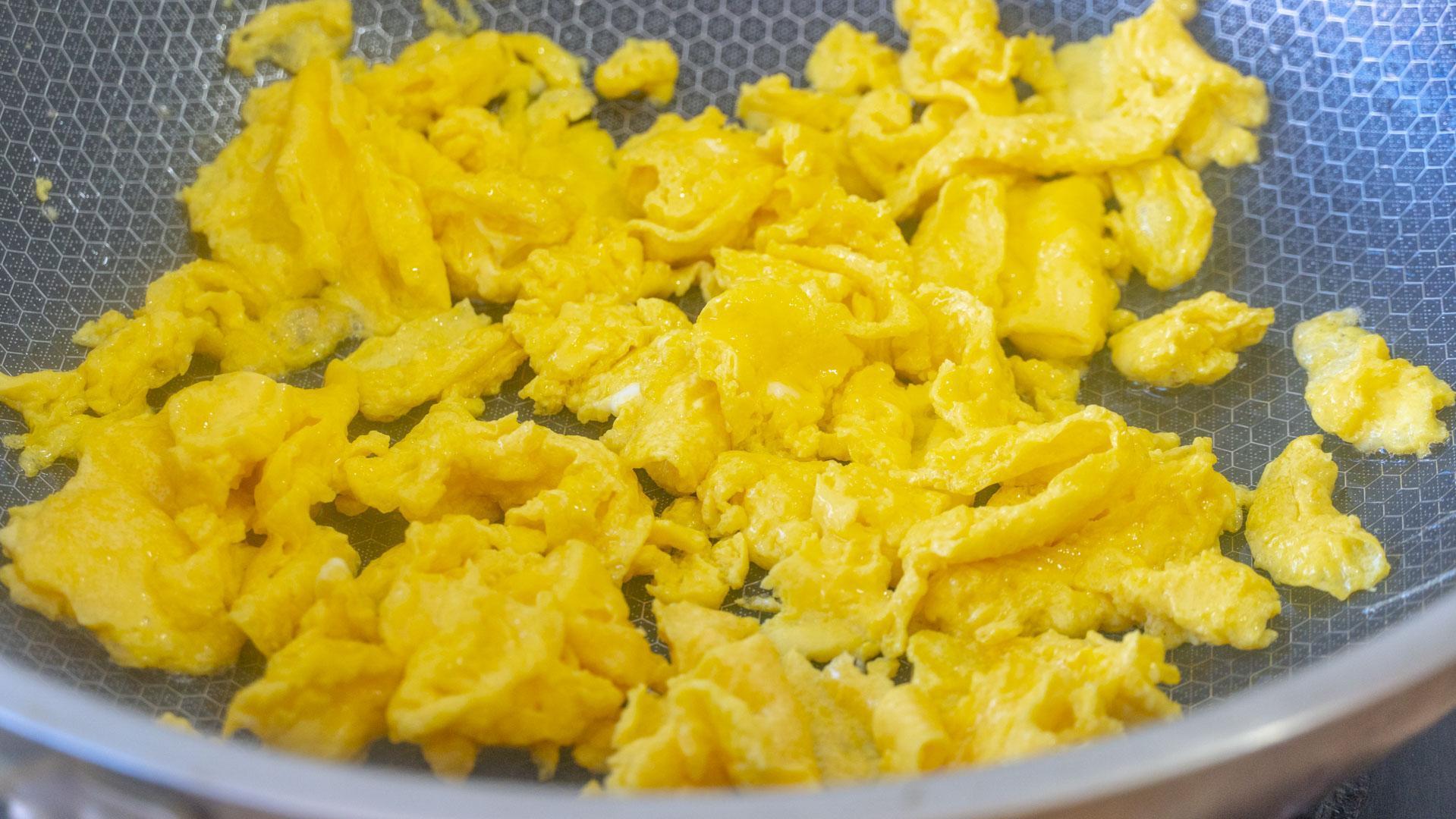 4、碗裏打入3個雞蛋,加一勺鹽後攪散,起鍋熱油,先倒入蛋液滑散,炒成雞蛋碎後盛出來。