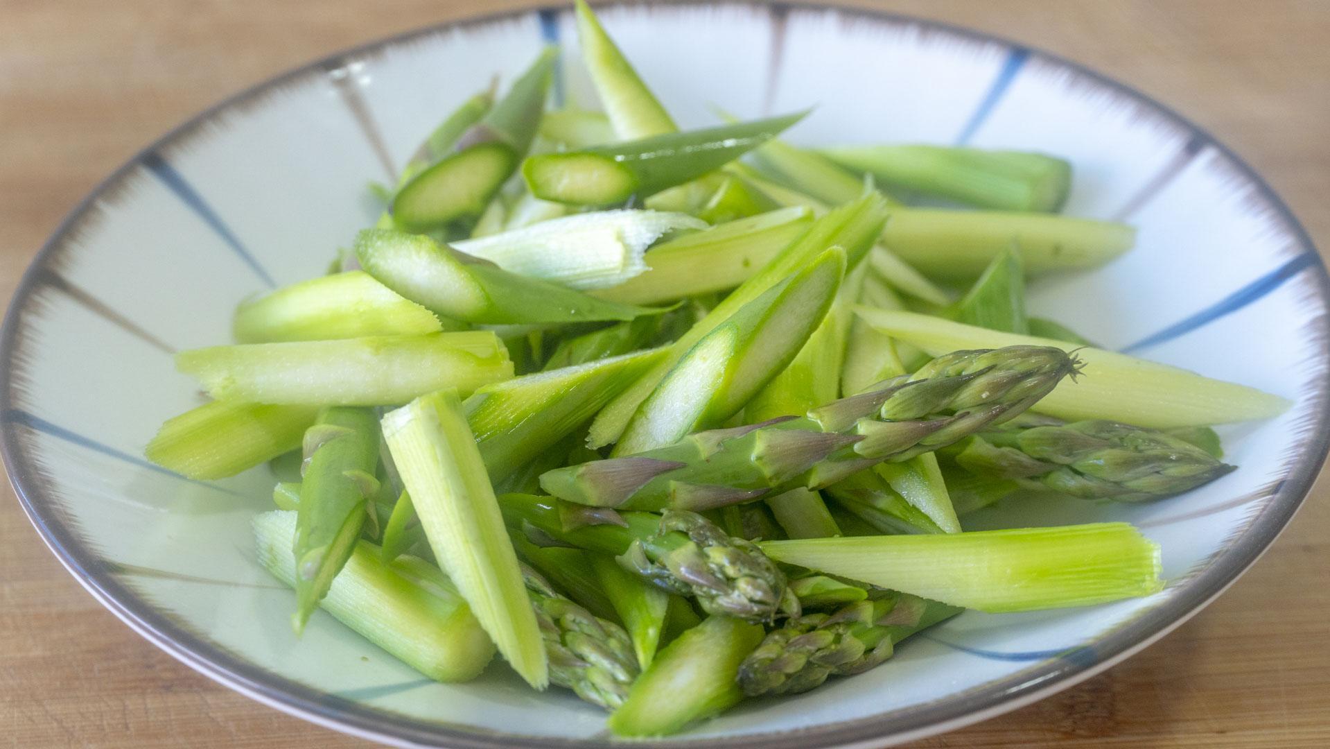 1、蘆筍300克去掉老的根後削皮,然後切小段兒備用。