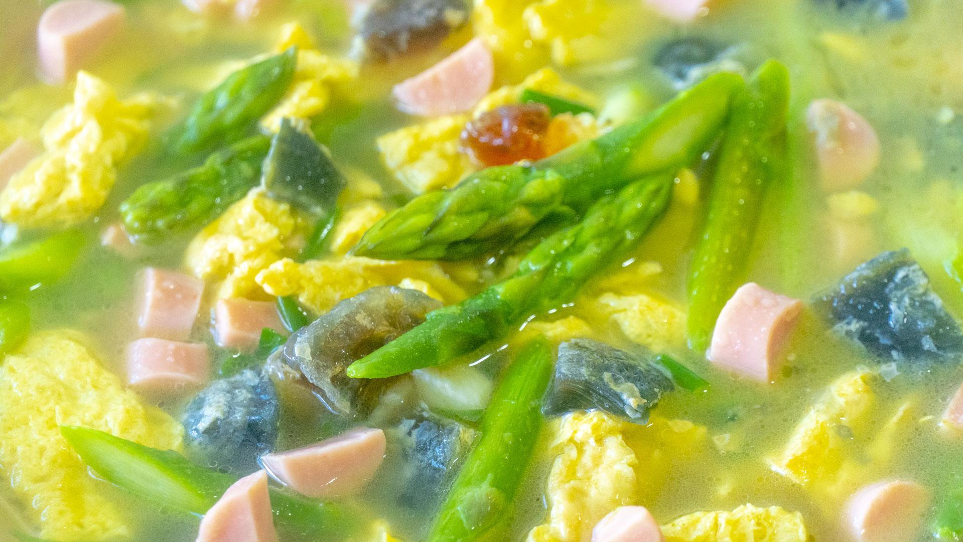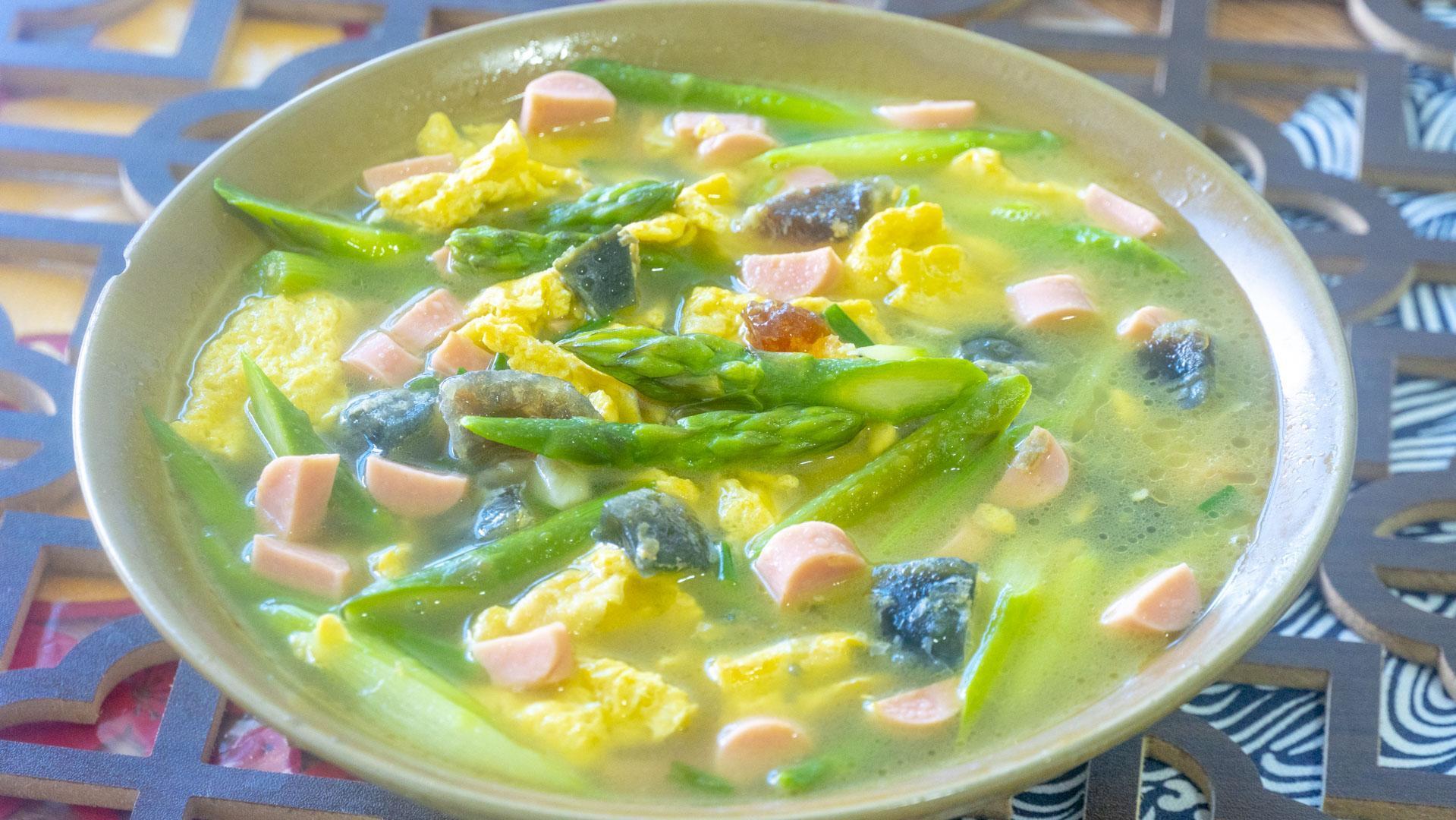 食材:蘆筍300克、皮蛋1個、泡麪搭檔火腿腸2根、雞蛋3個、蔥、姜、蒜