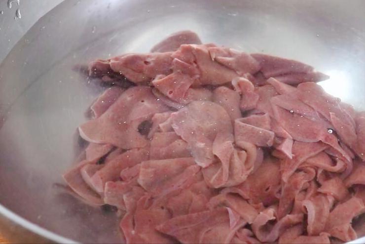 1、首先把豬心切成四份放入碗中,加水清洗乾淨,然後取出來放在菜板上切成薄片,切好之後放入涼水中給它浸泡半個小時左右,祛除腥味;