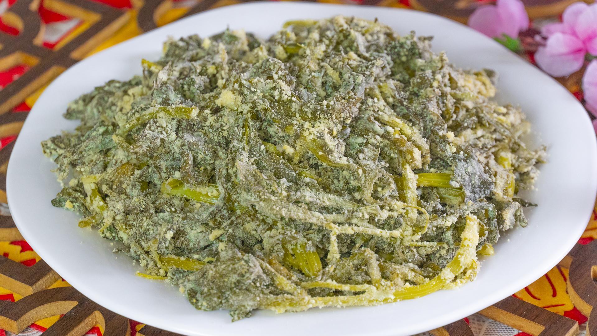 4、接着將拌好的麪粉撒在茼蒿上面,再輕輕的抓拌均勻,水開後將茼蒿放進來,放進去的時候要鬆散一些,不要堆的太緊實了,也千萬不要按壓,水開上汽後,大火蒸5分鐘,麪粉蒸熟了就可以了。