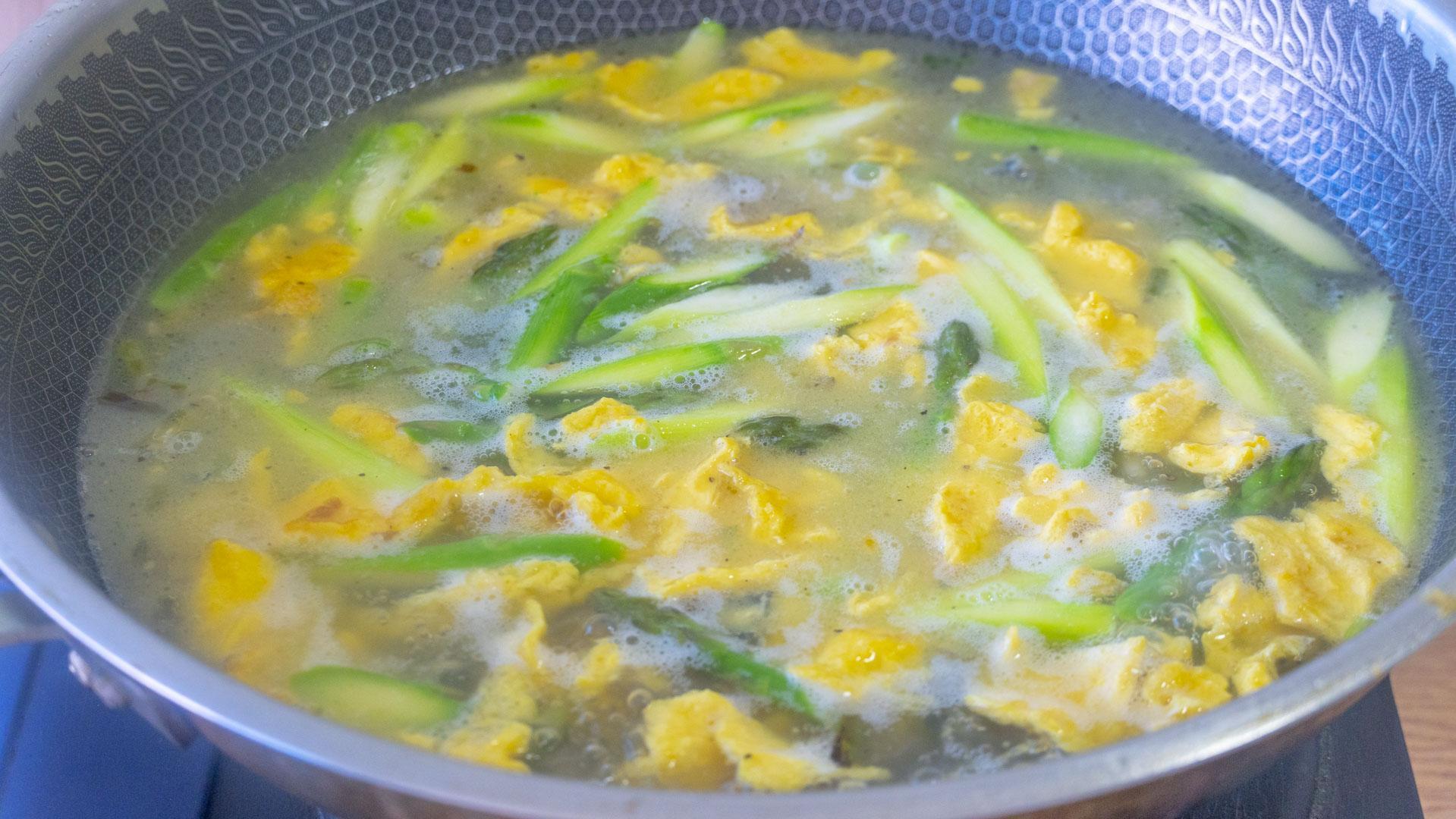 6、大火煮開後轉小火再煮2分鐘,蘆筍煮熟後撒上小蔥花,就可以關火出鍋了。
