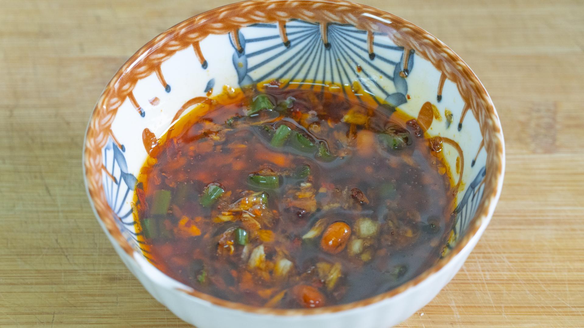 6、大蒜半頭,拍碎後裝入碗裏,加少許鹽搗成蒜泥,接着加醬油、醋、生抽、香油,辣椒油,蔥花,拌勻後就可以了。