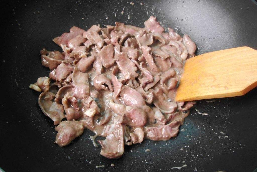5、鍋中倒入適量的油,把油溫燒至六成熱,再把醃製好的豬心倒進去,快速的翻炒至豬心變色,把豬心先炒一炒,然後控油,盛出來裝入盤中。