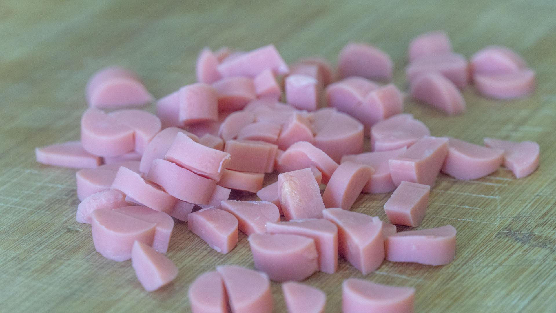 3、火腿腸2根,從中間一分爲二後也切成小丁。